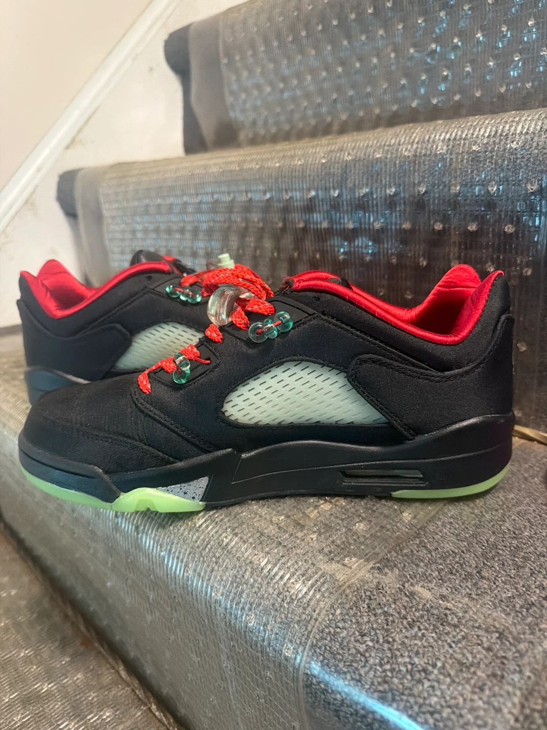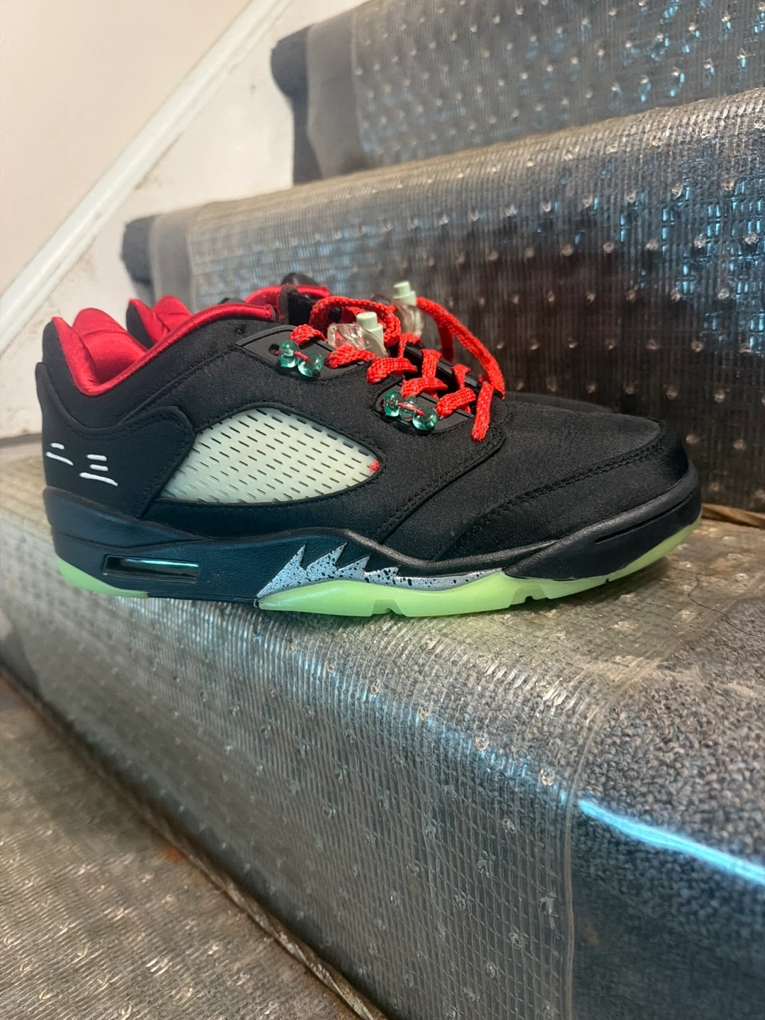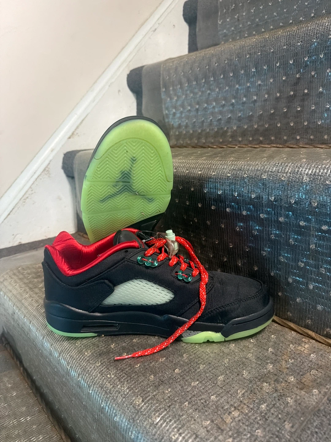 Buy & SellAir Jordan 5 Retro Low size 9.5Air Jordan 5 Retro Low size 9.5$140Selling a pair of Air Jordan 5 Retro Low shoes. They are size 9.5. The shoes are black with red accents and a light green soleConditionLike newSize9.5BrandAir JordanWHERE TO MEETCheck LocationView MapSELLERverifiedMarkieMilliken600 reviews2 chats·2 favorites·49 viewsSEND CHAT TO SELLERHi Markie! I’m interested in your listing.Hi Markie! I’m interested in your listing.Get the Karrot app to chatSign In to chat