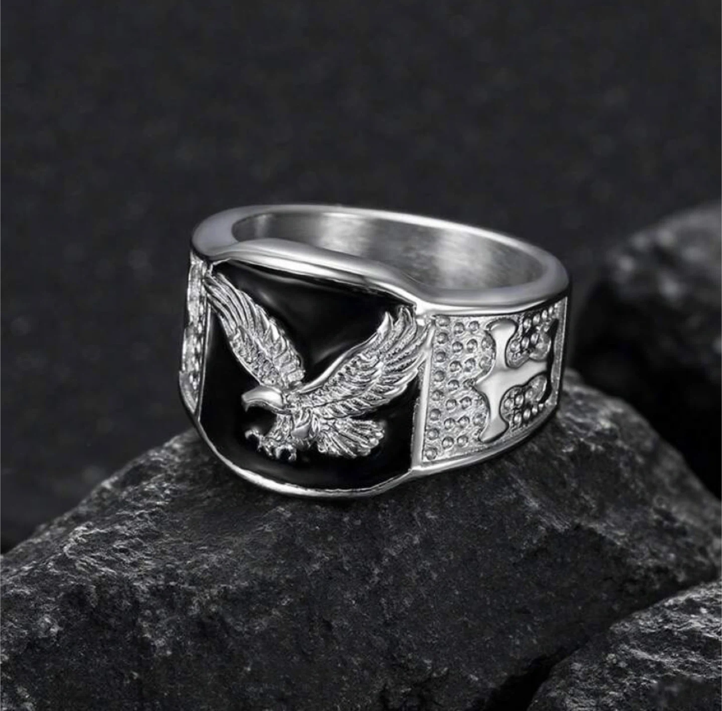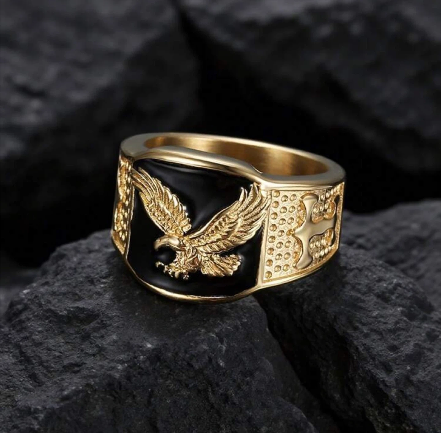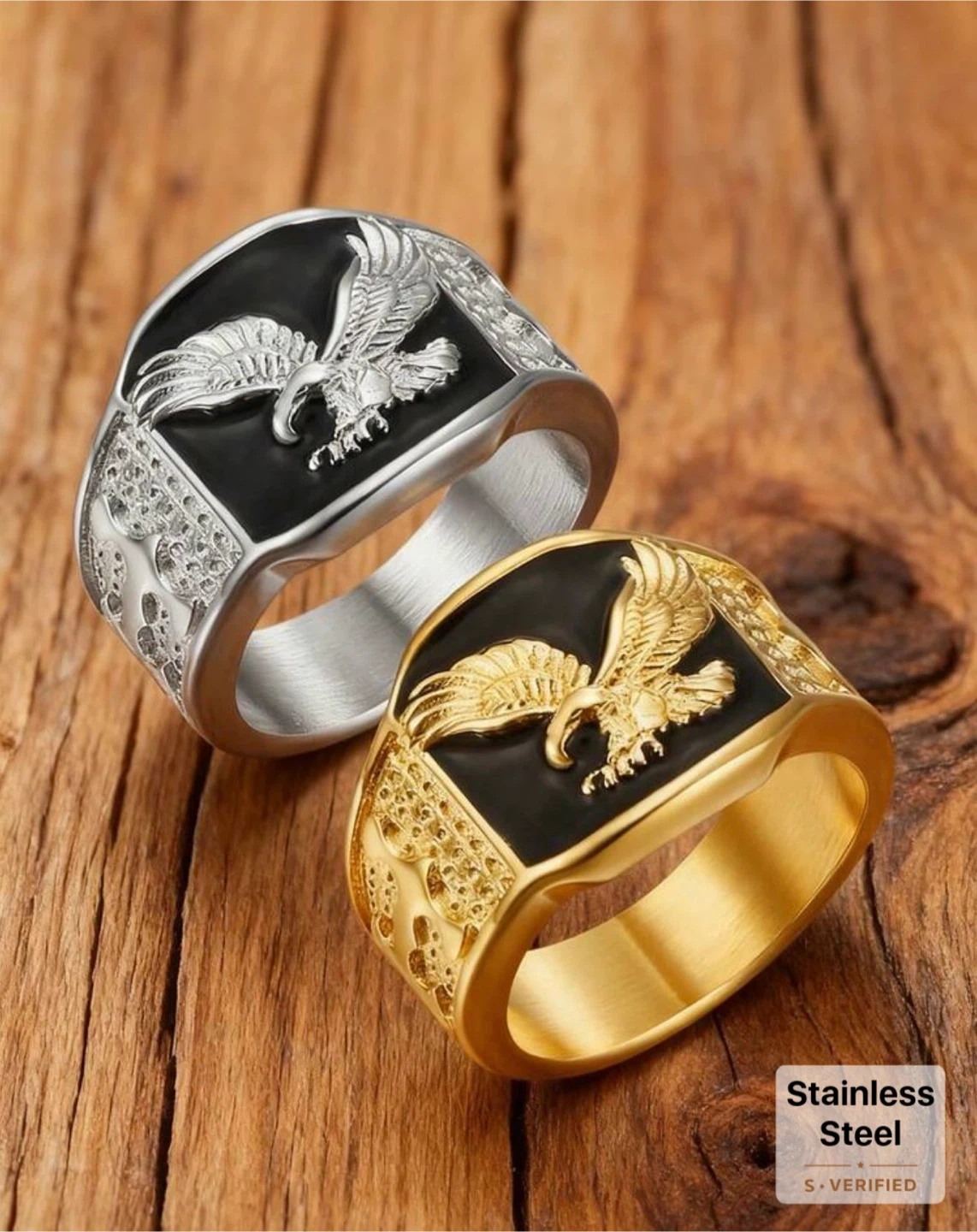 Check out these stylish rings! One is gold with an eagle design, and the other is silver with a similar design. They're both eye-catching