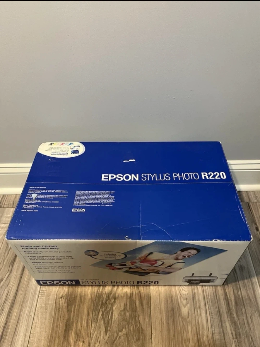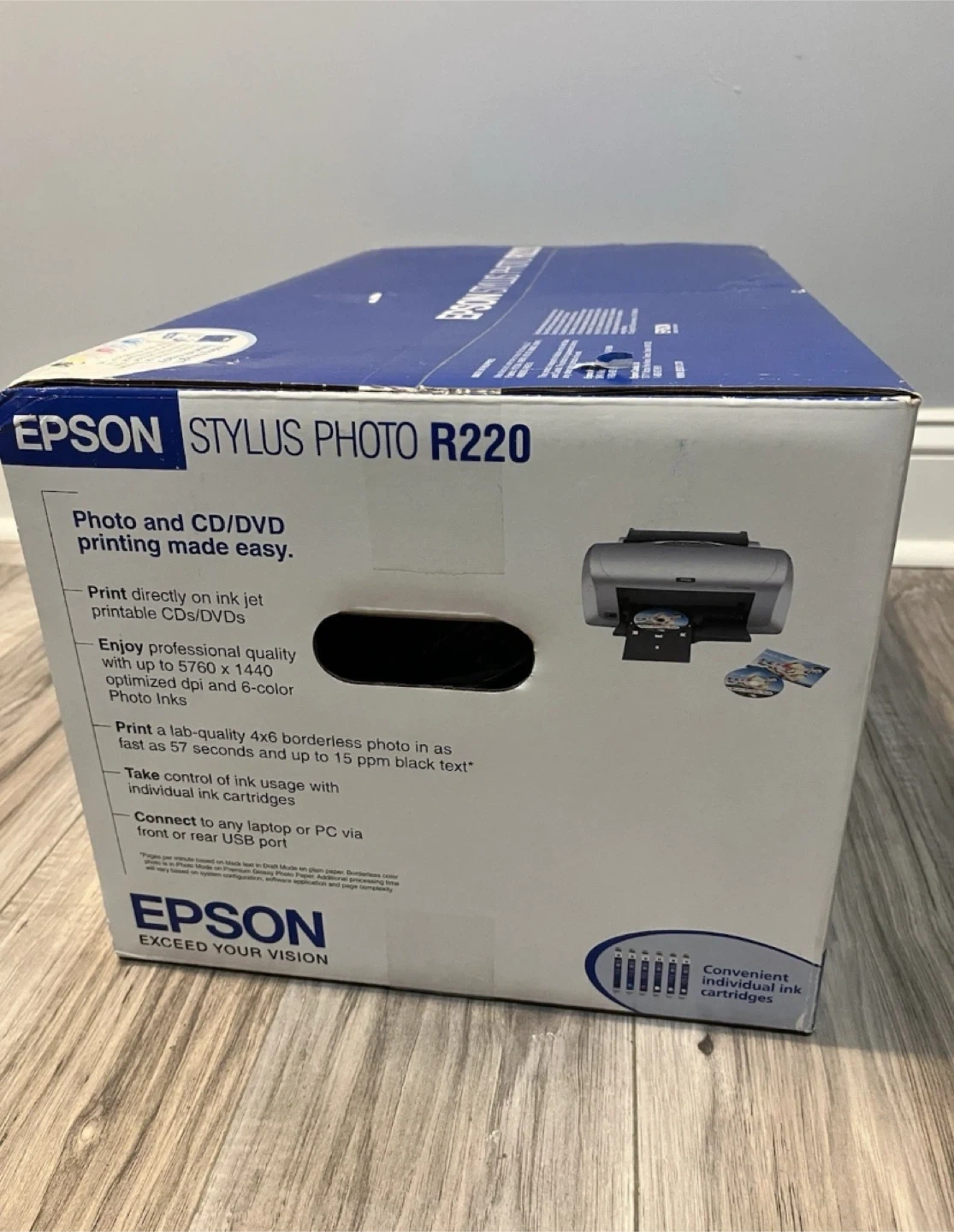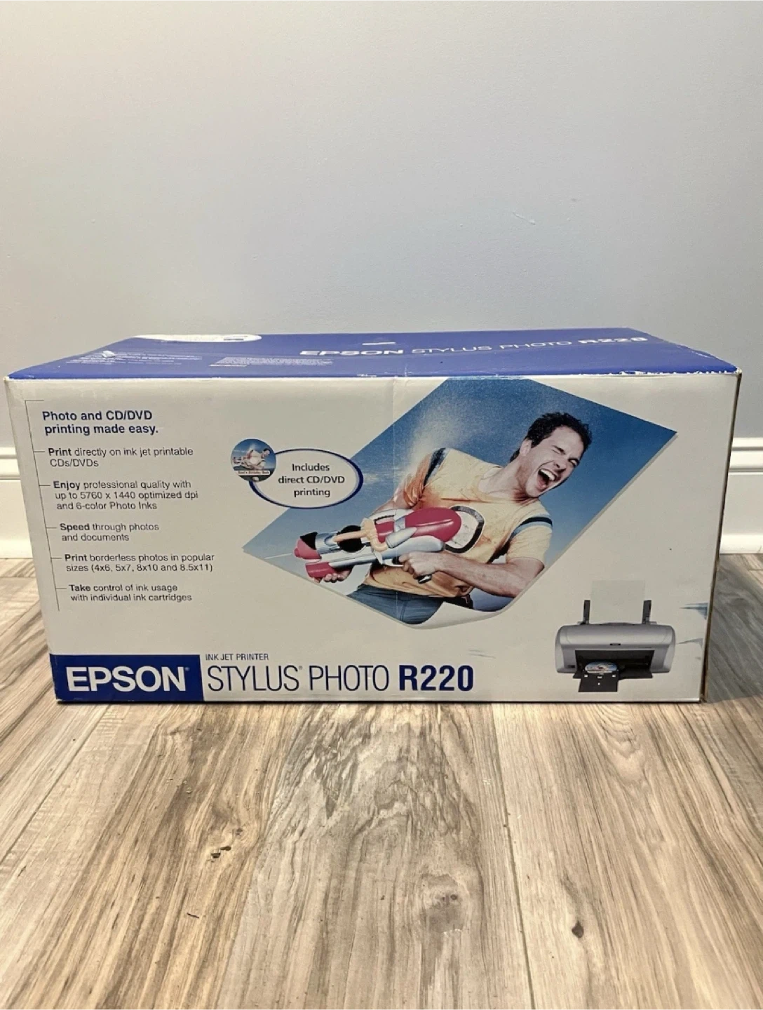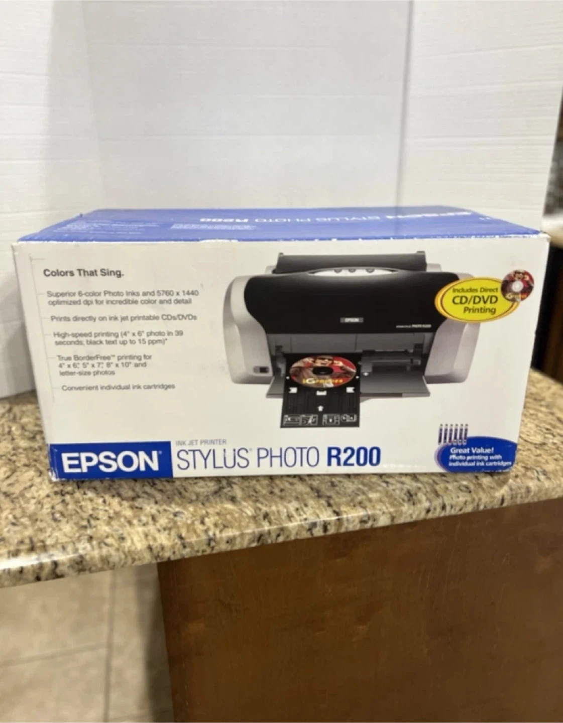 Selling a brand new Epson Stylus Photo R220 inkjet printer! It prints directly on ink jet printable CDs/DVDs. It can also print a lab-quality 4x6 borderless photo in as fast as 57 seconds and up to 15 ppm black text.