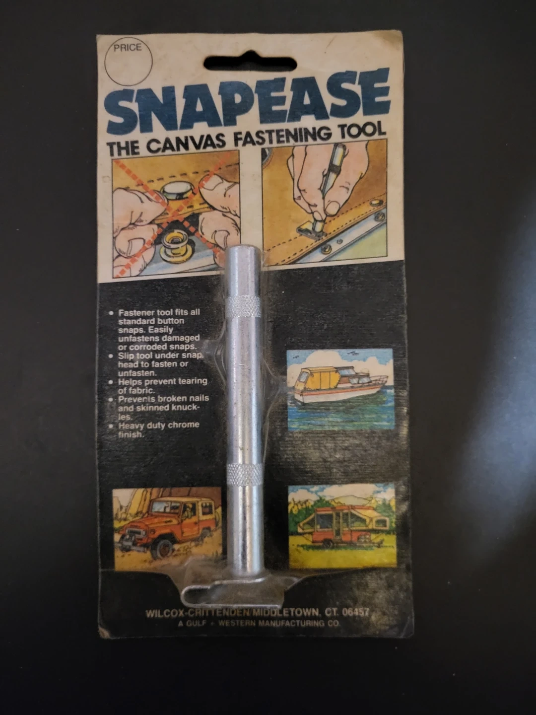 Selling a SNAPEASE canvas fastening tool. It helps prevent tearing of fabric, and protects broken nails and skinned knuckles. The fastener tool fits all standard button screws and easily unfastens damaged or corroded snaps. It also features a heavy duty chrome finish.