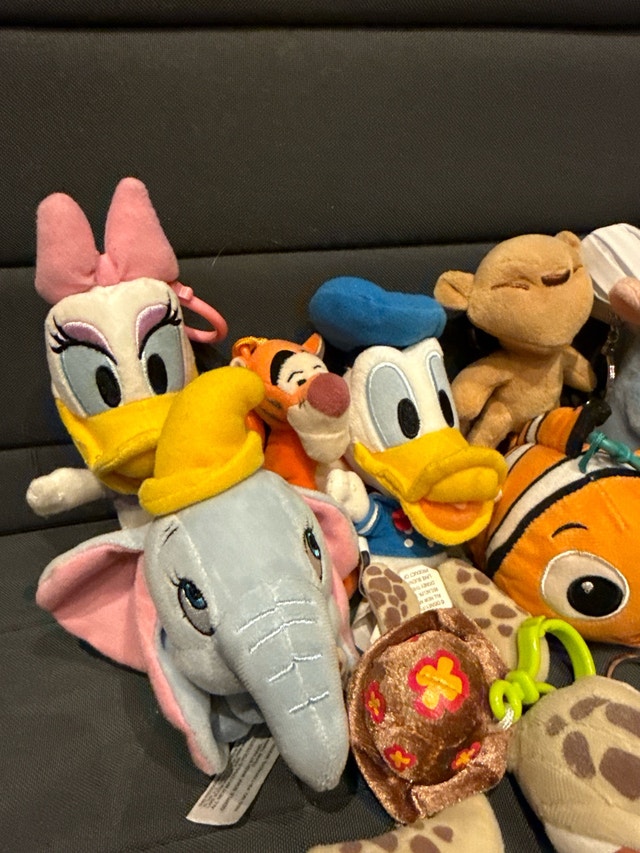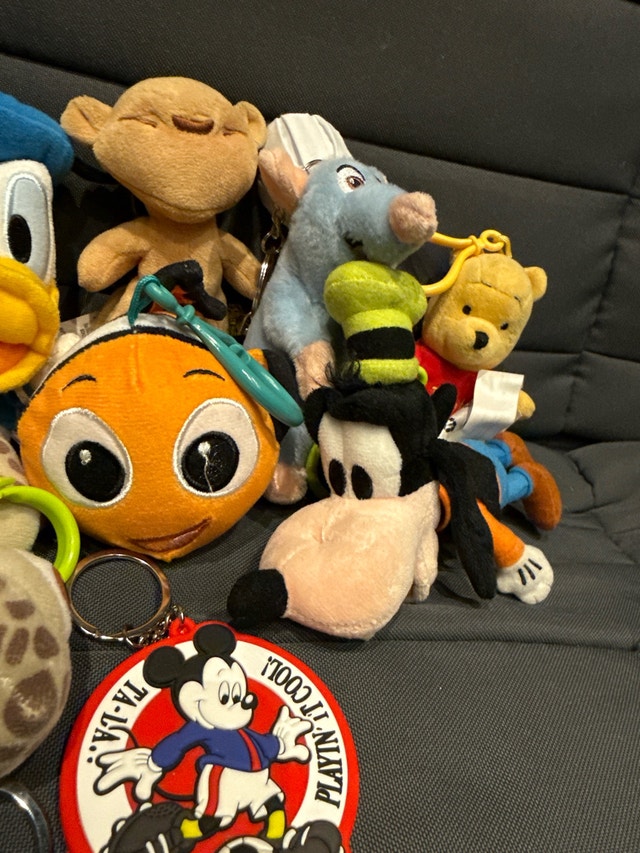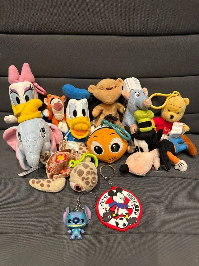 This is a lot of used Disney plush keychains, as pictured. Add a dash of pixie dust to your daily grind with these adorable Disney plush keychains! Perfect for backpacks, keys, or jazzing up your jacket. They're so cute, you might just burst into song – but don't worry, no one will judge! These are all direct from Disney Parks, take them all for $5 !