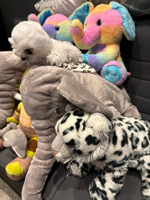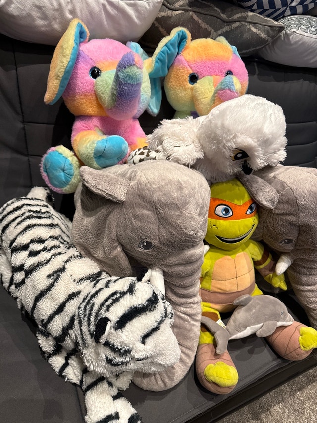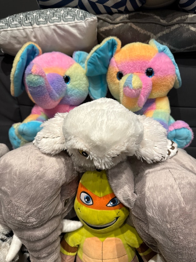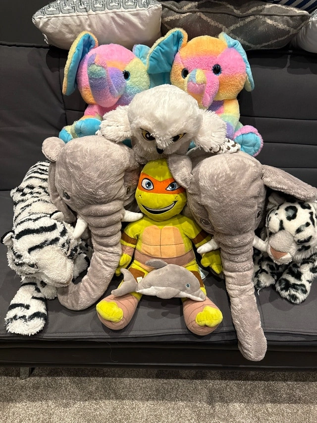 A menagerie of plush companions seeks a new home, each with its own unique charm and ready for cuddles. These used stuffed animals, including elephants, a turtle, and a snow leopard, have provided comfort and joy and are eager to continue their adventures with you. Take them all for $5!