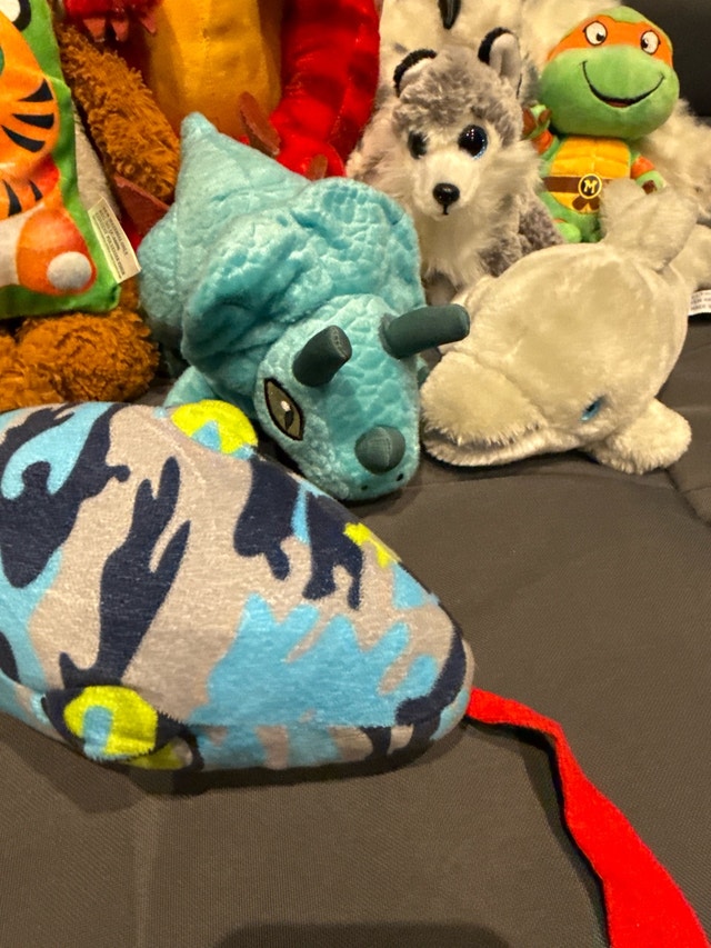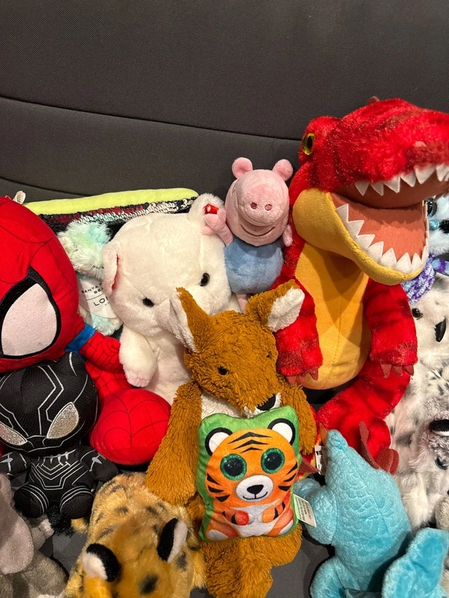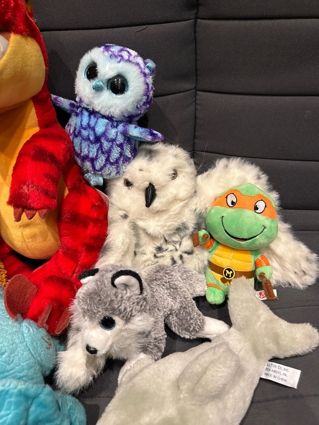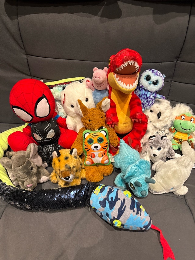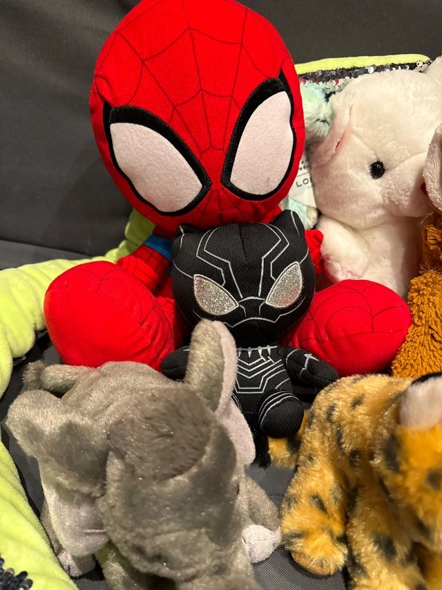 Selling a diverse collection of plush toys, perfect for kids or collectors. This assortment includes popular characters like Spiderman, Black Panther, and Teenage Mutant Ninja Turtles, alongside a cute variety of animals such as owls, dogs, and dinosaurs. All toys are in used condition, showing some signs of play but still plenty of love to give. I'm clearing out space, so these cuddly friends are looking for new homes. They're all set to bring joy to their next owner. A great deal for anyone looking to expand their plush collection or find a comforting toy for a child!