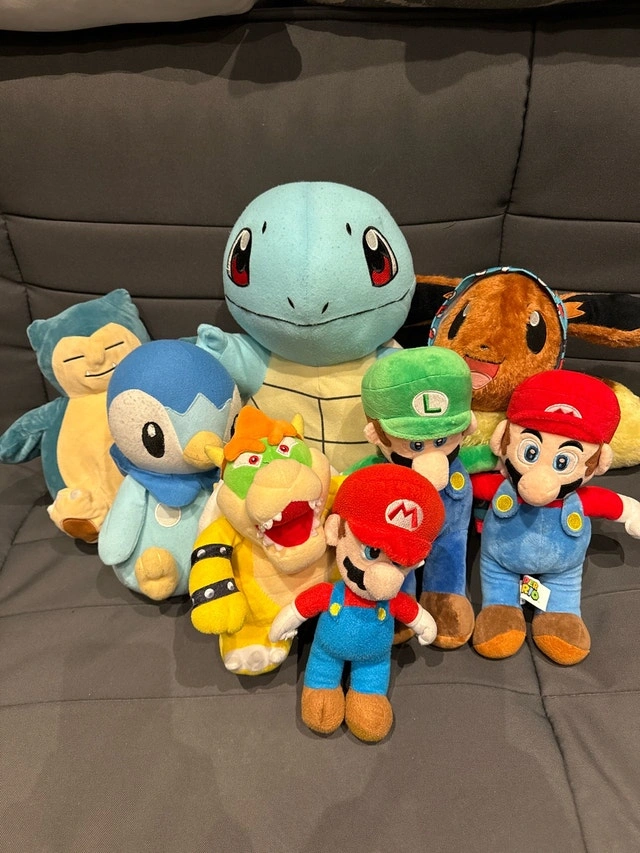 This delightful collection of used Pokemon and Mario plush toys is ready for a new home! Each character, from Squirtle to Mario, brings a touch of nostalgia and fun. Perfect for collectors or as cuddly companions. Some wear and tear might be visible, as these plushies have been well-loved, but they're all in good, clean condition and ready for new adventures! These guys would love to come home with you. If the ad's still up, they're still available, just waiting for a playdate! Take them all for $5!