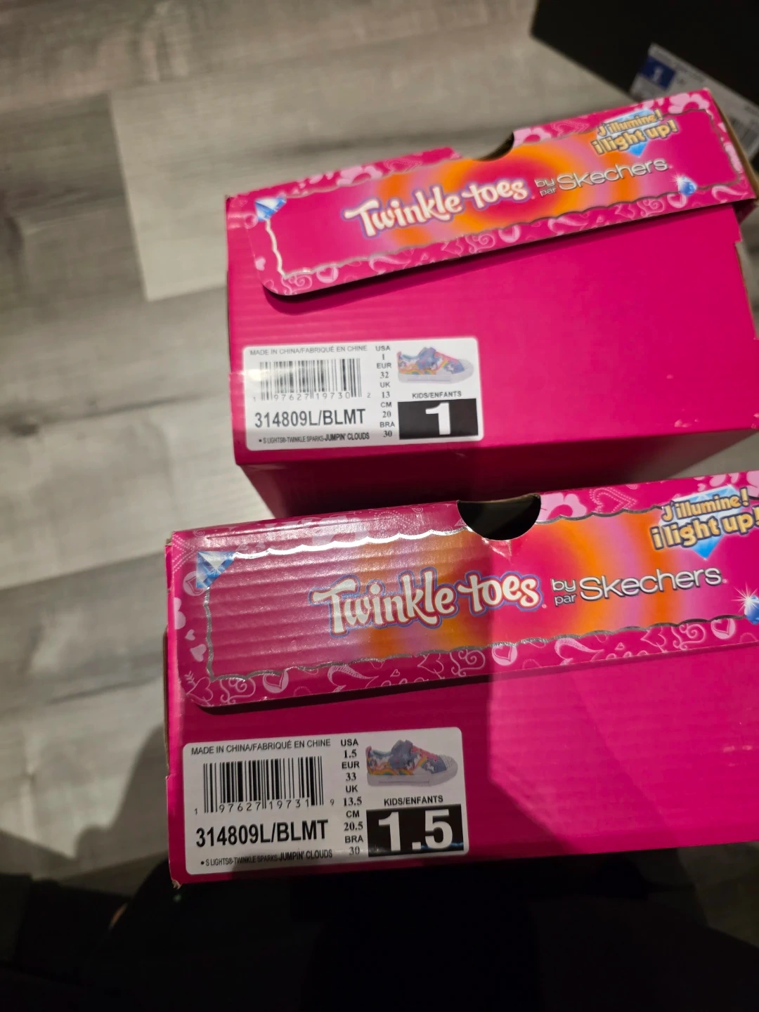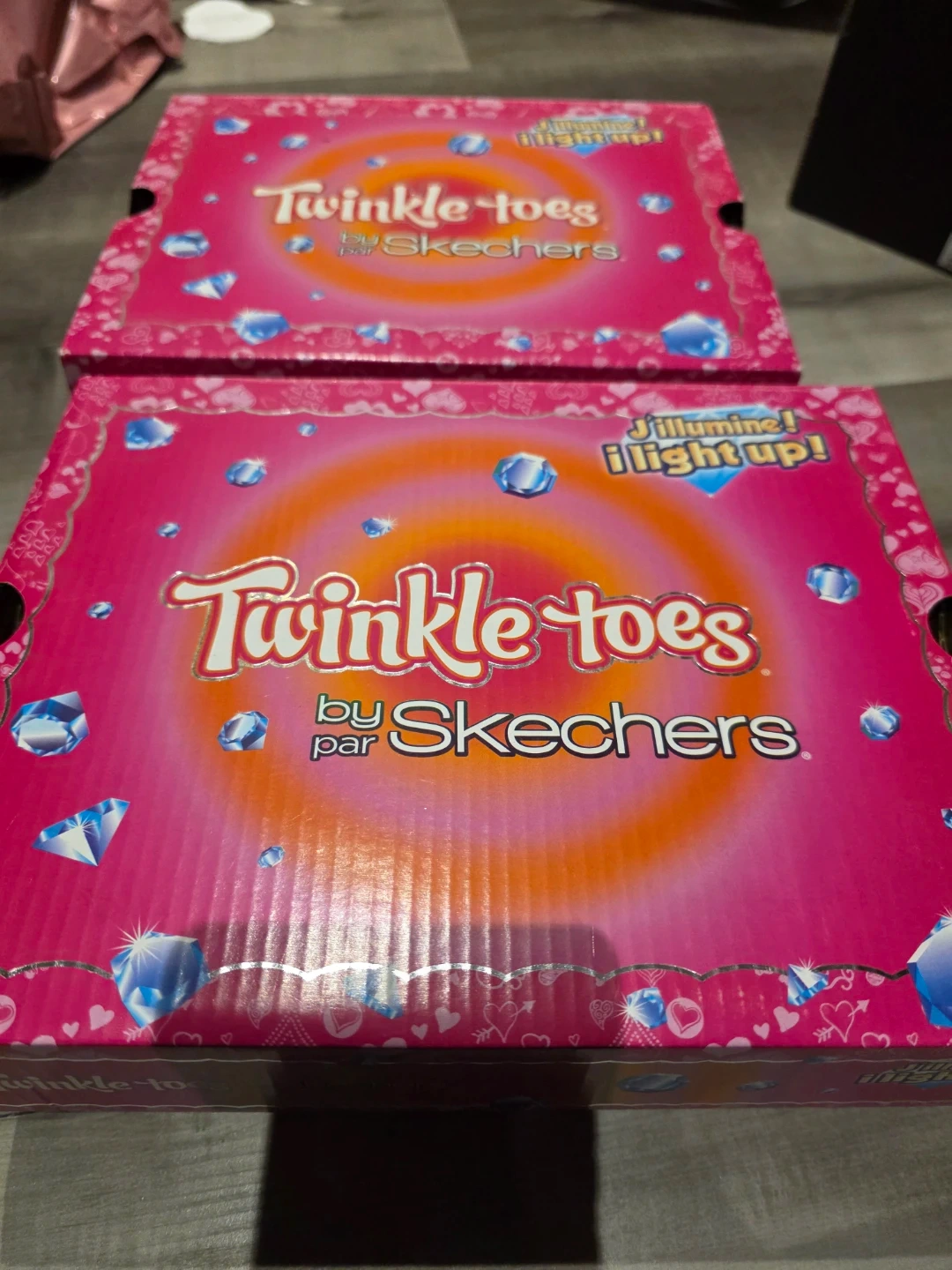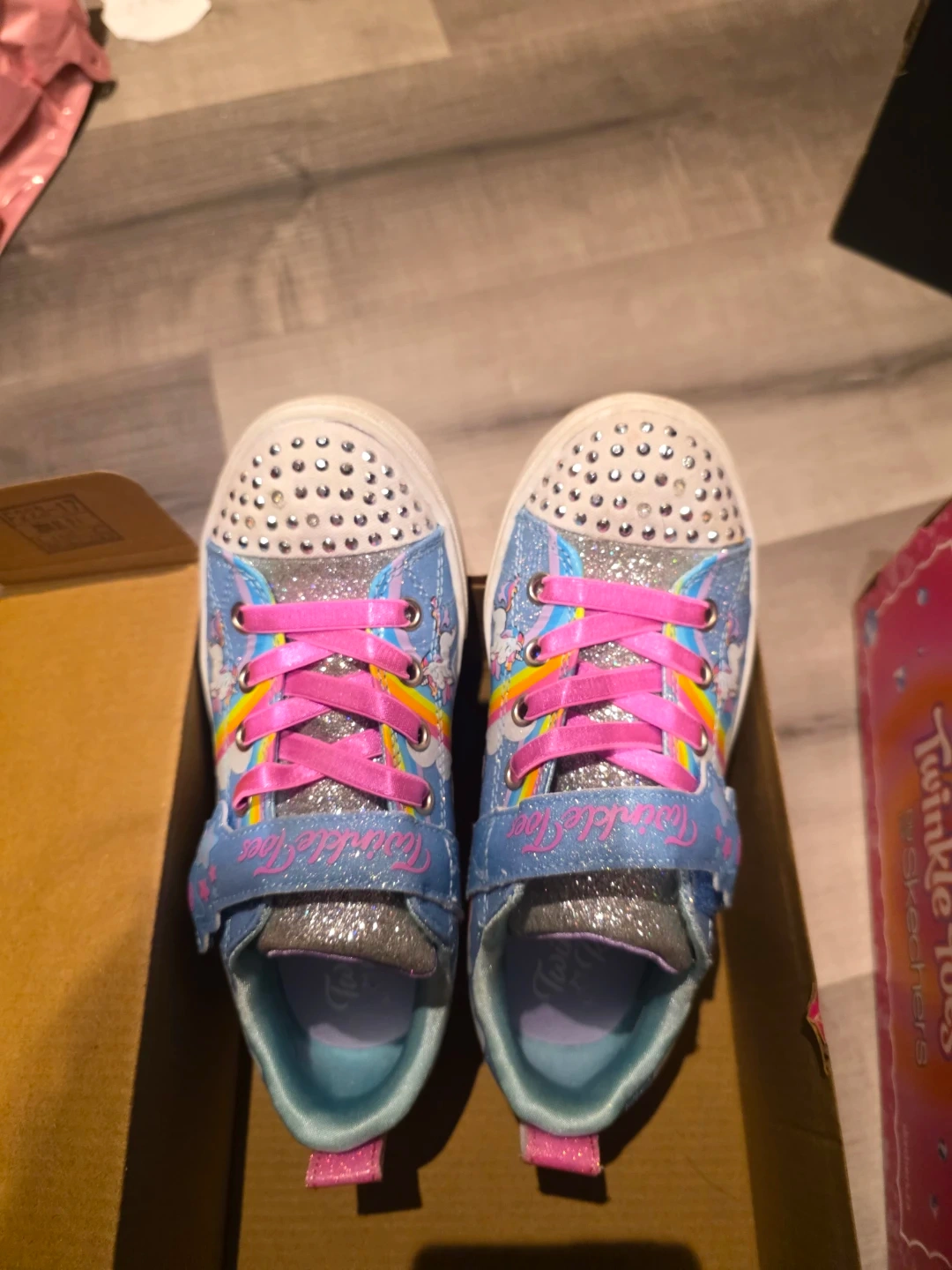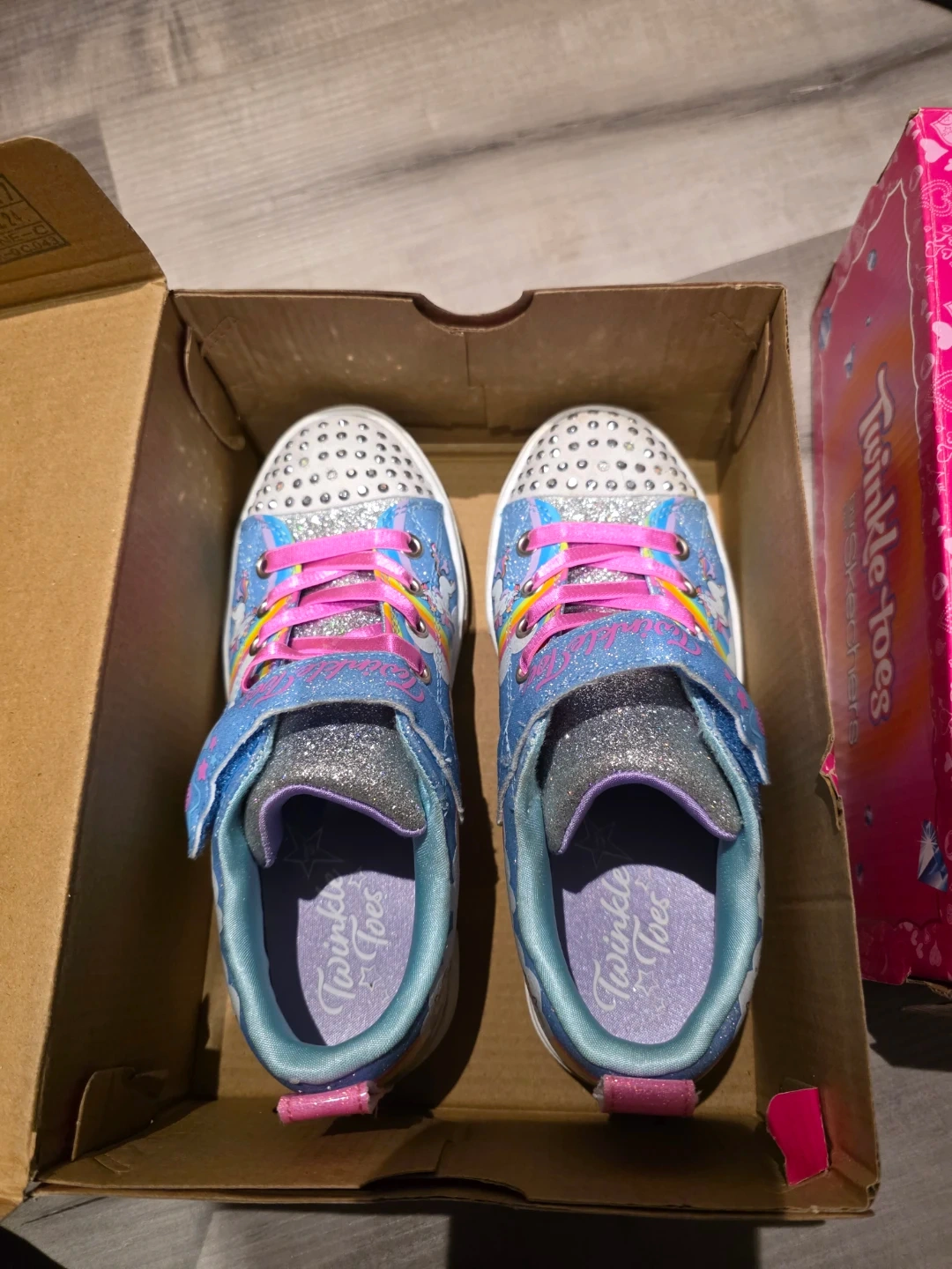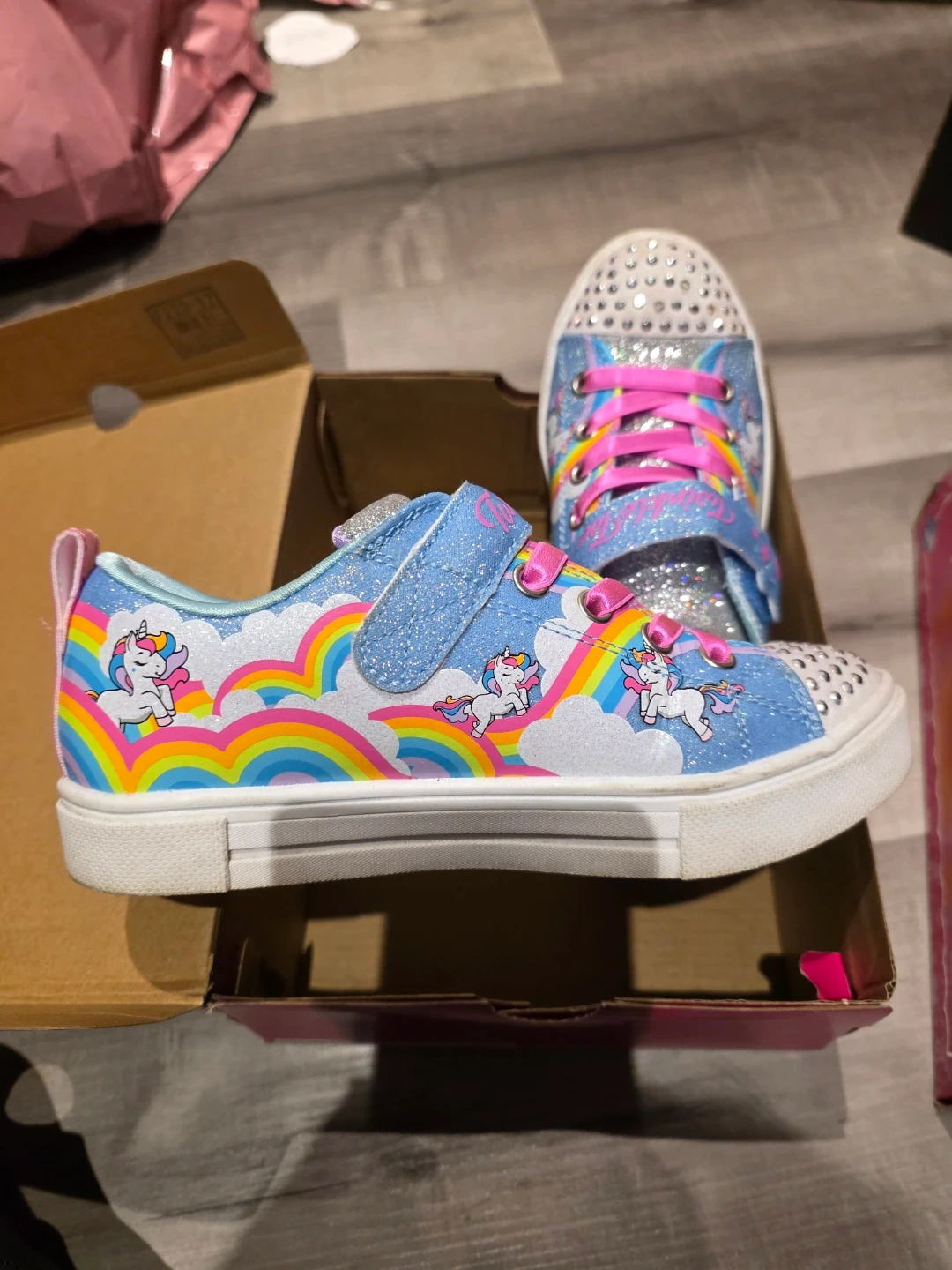 These adorable Skechers Twinkle Toes feature a cute unicorn and rainbow design! They light up, adding a fun touch to any outfit. They come with the original box
