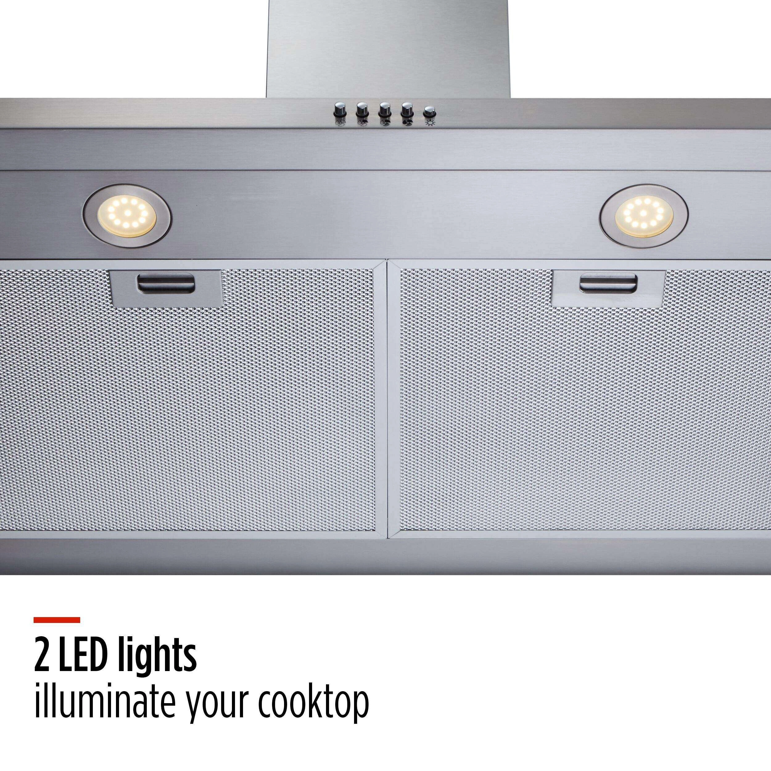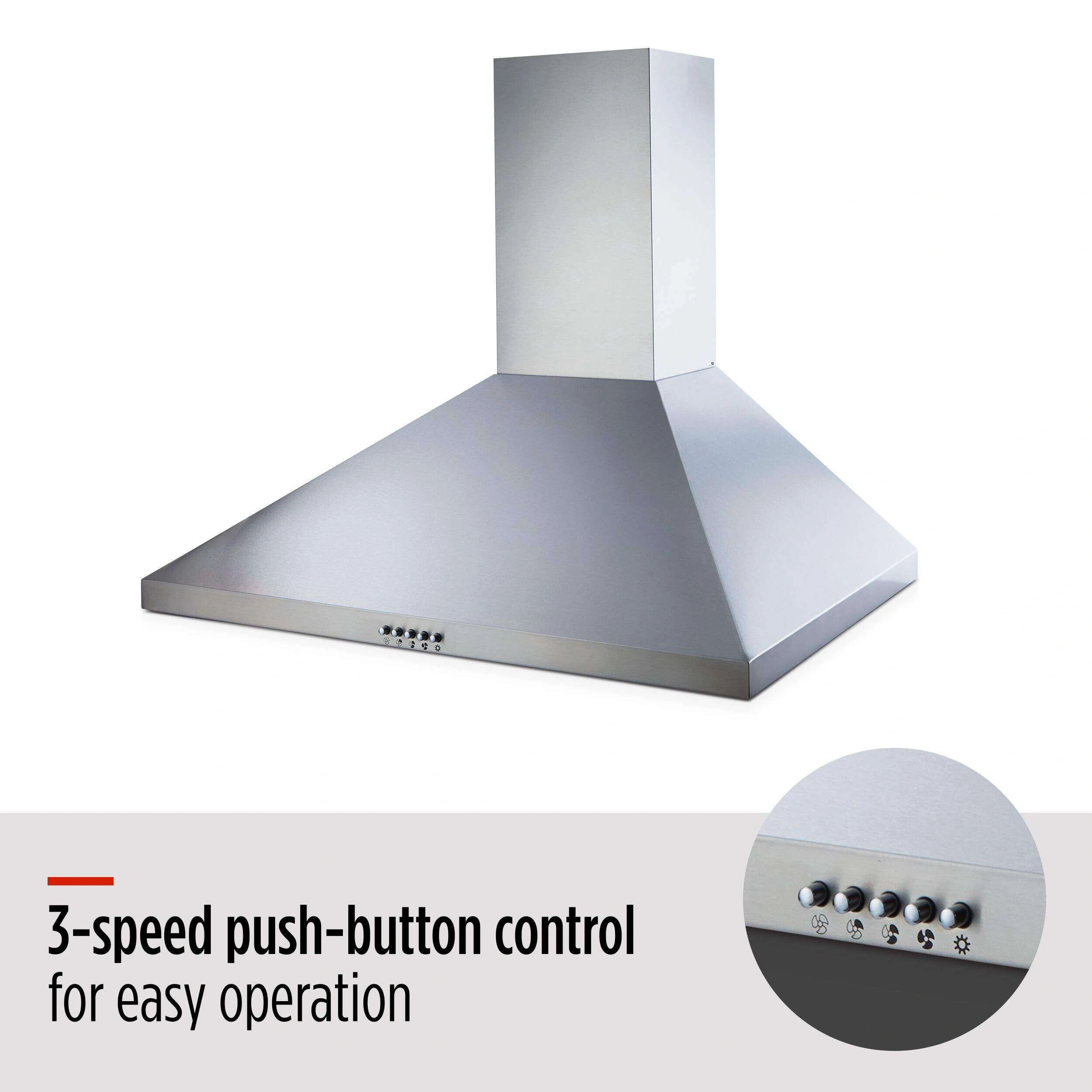 For better air quality and circulation in your kitchen, consider the MASTER Chef Pyramid Range Hood. This oven range hood is built with a powerful yet quiet 380 CFM blower with three different fan speeds to successfully remove heat, fumes and smoke while you're cooking, helping to ensure your kitchen stays clean and odour-free before and after meals. This wall mount range hood is functionally designed for easy installation and operation, featuring push-button controls that allow you to quickly change the fan speed as needed. There are also two micro-mesh filters included in this kitchen hood that have a quick-release latch and are dishwasher-safe for no-fuss cleaning. This pyramid range hood also includes two LED lights to provide better visibility over your cooktop, so you can ensure every recipe is just right. The stainless steel construction gives this range hood vent lasting durability and adds a sleek finish to your cooking area that blends in with your other appliances and existing décor. As stylish as it is functional, this stainless steel range hood has a pyramid-shaped design for an eye-catching look that also provides a large suction area.