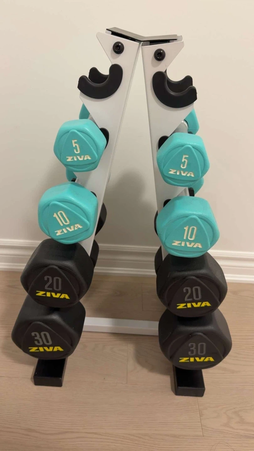 Selling a complete set of Ziva dumbbells with a rack. This set includes 5 lb, 10 lb, 20 lb, and 30 lb dumbbells. Also comes with a bench. Perfect for a home gym setup!