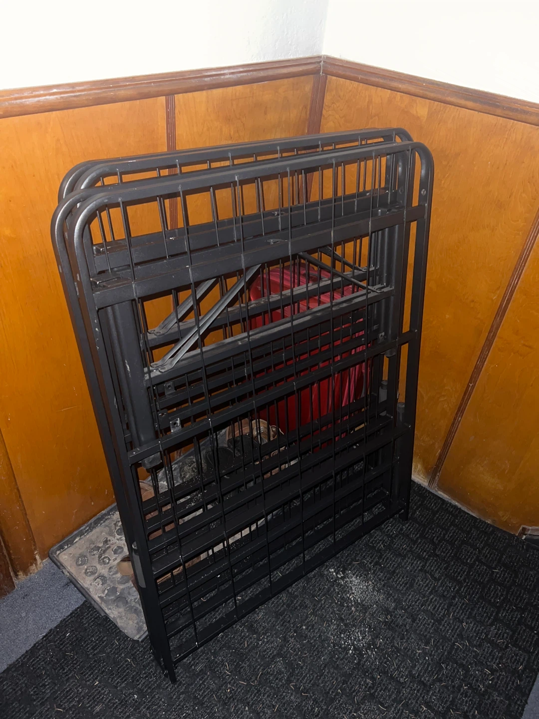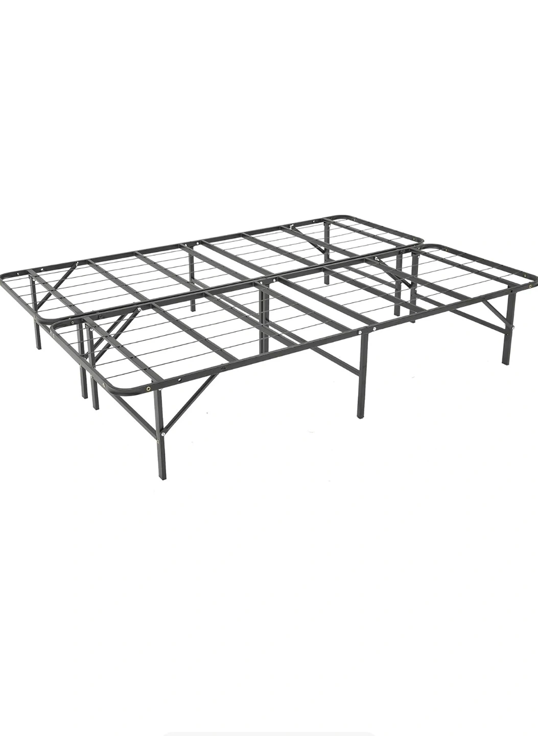 Selling a folding metal bed frame in black. It's in good condition and folds up for easy storage and transport when not in use. Perfect for guest rooms! Comes with all screws and bolts for easy assembly. 16” tall. Can easily hold storage under bed.