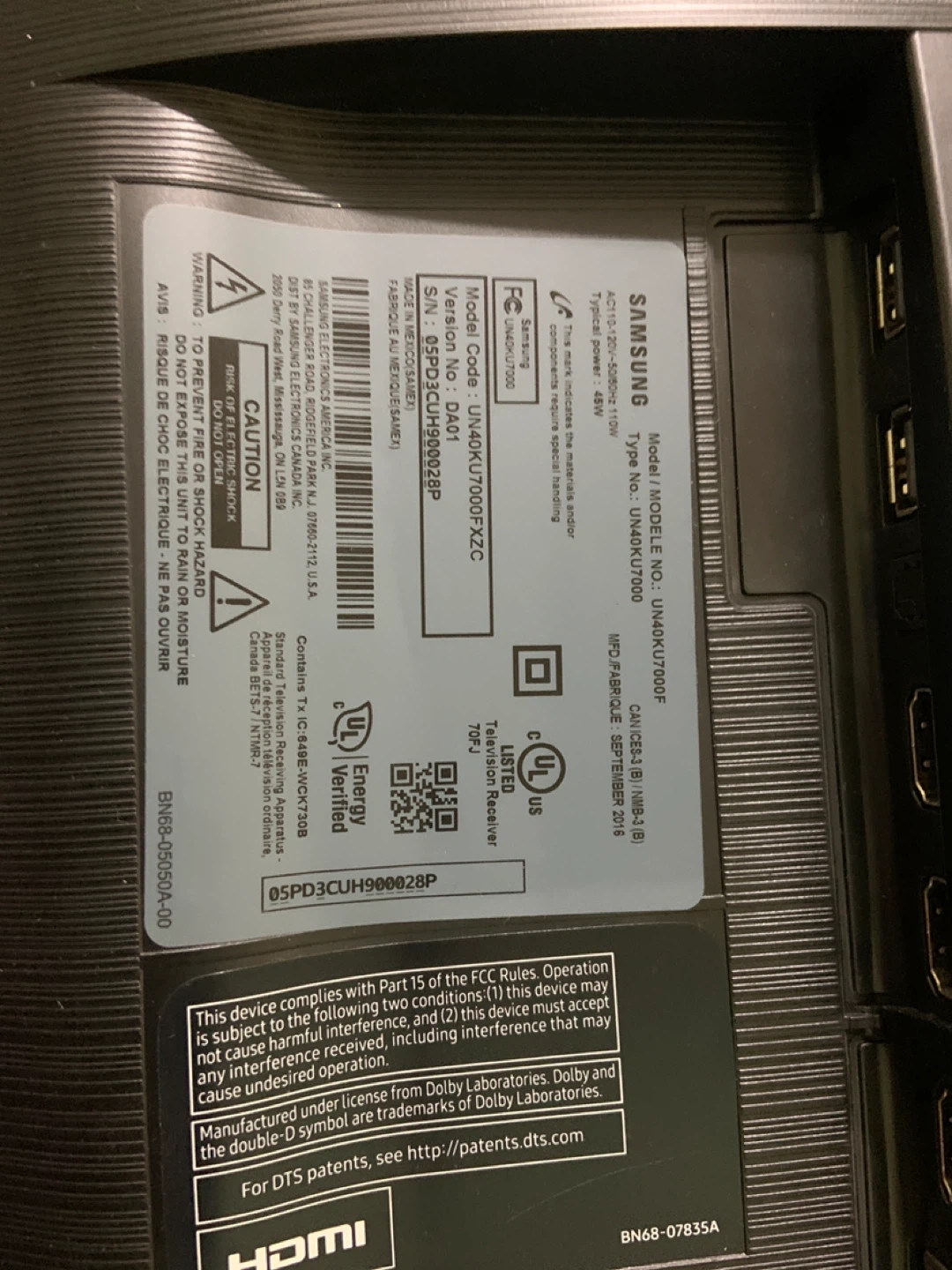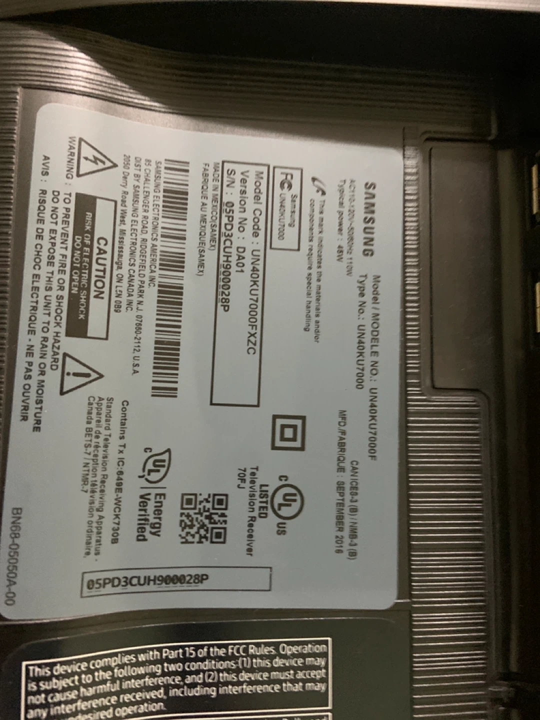 Selling a Samsung 40" 4K UHD TV, model number UN40KU7000F. This TV has a typical power of 48W and was manufactured September 2016. It's in great working condition and ready for a new home entertainment setup