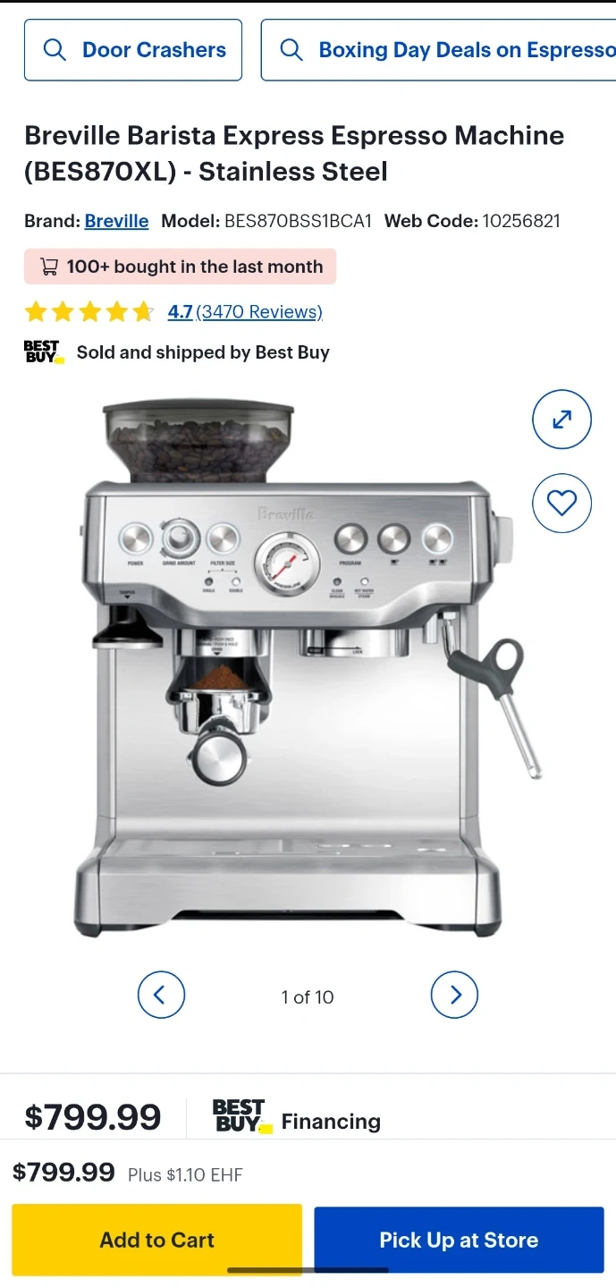 Selling a Breville Barista Express Espresso Machine (BES870XL) in stainless steel! Originally selling for $799.99 at Best Buy.