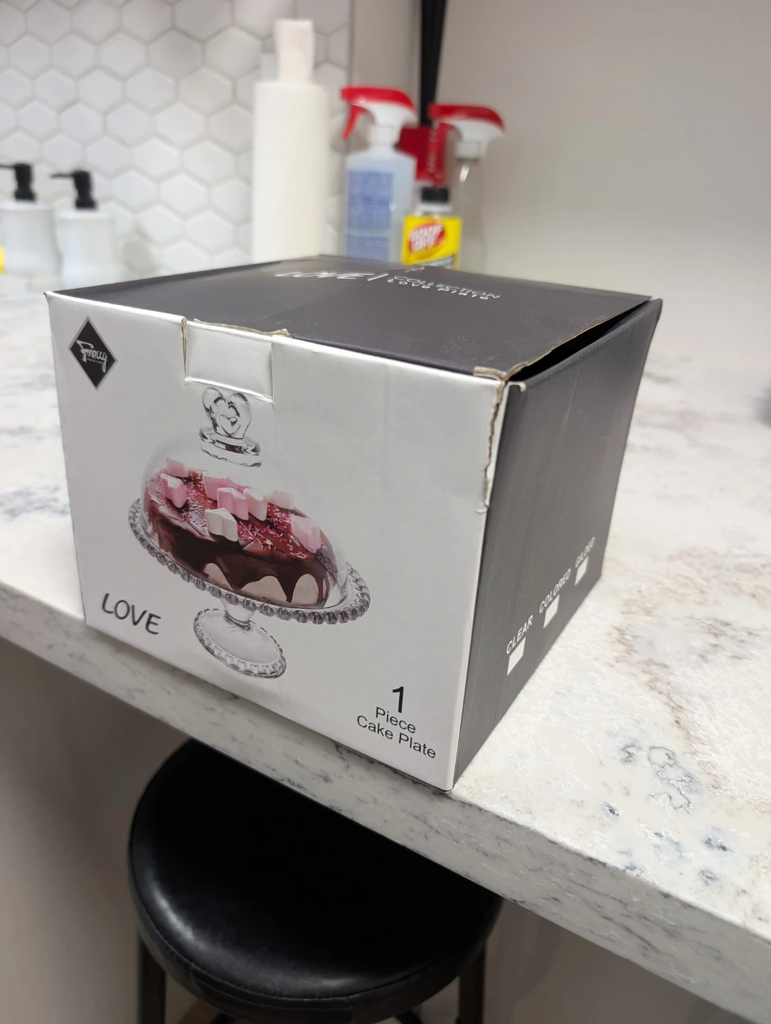 Selling a lovely cake plate with a dome. It's new ! The plate is approximately 19.5cm in diameter and features a beautiful gold-coloured trim and a heart-shaped handle on the dome.