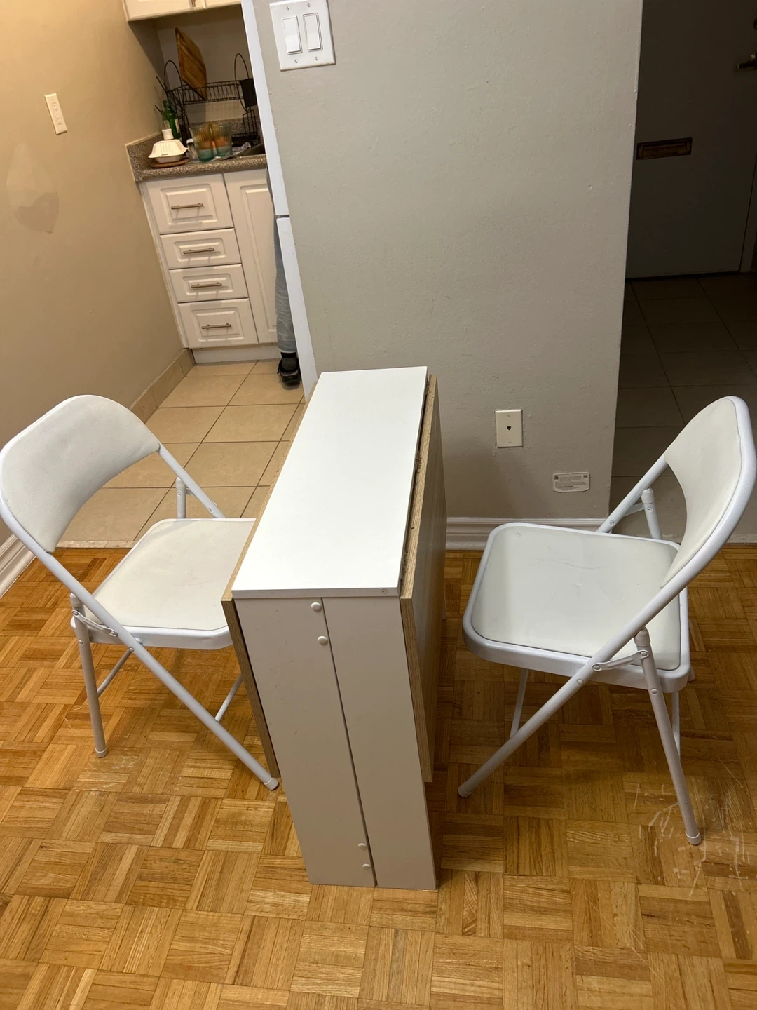 Selling a folding dining table with two white folding chairs. The table has a light wood-look top with a white centre strip and white legs. Great for small spaces!
