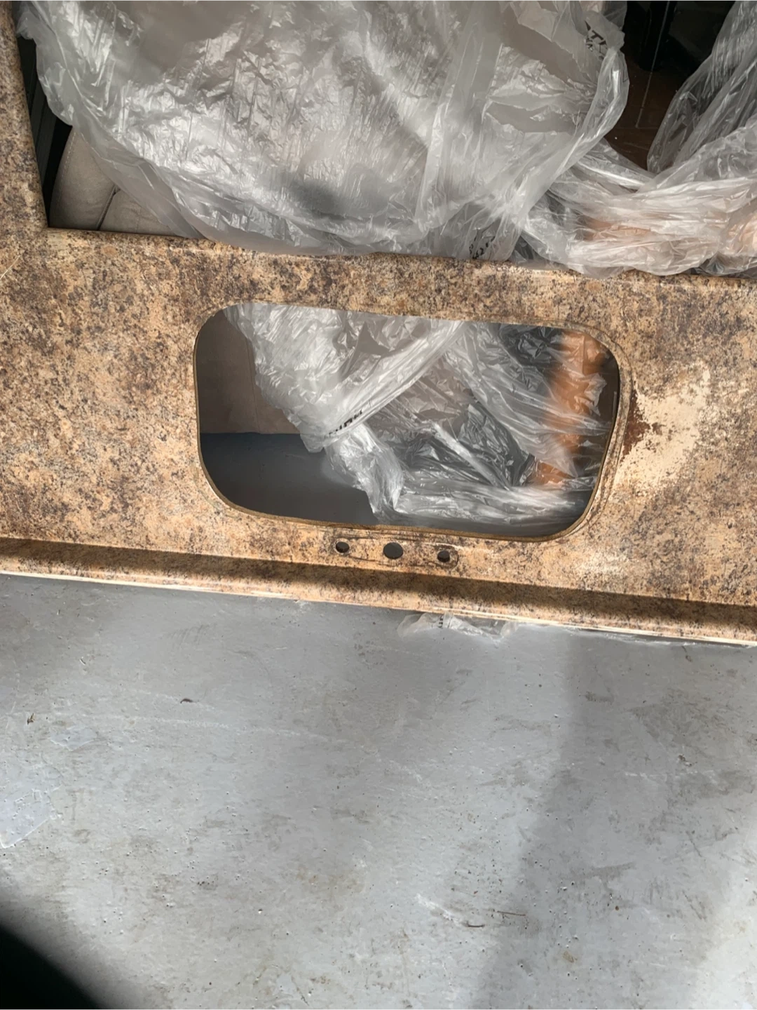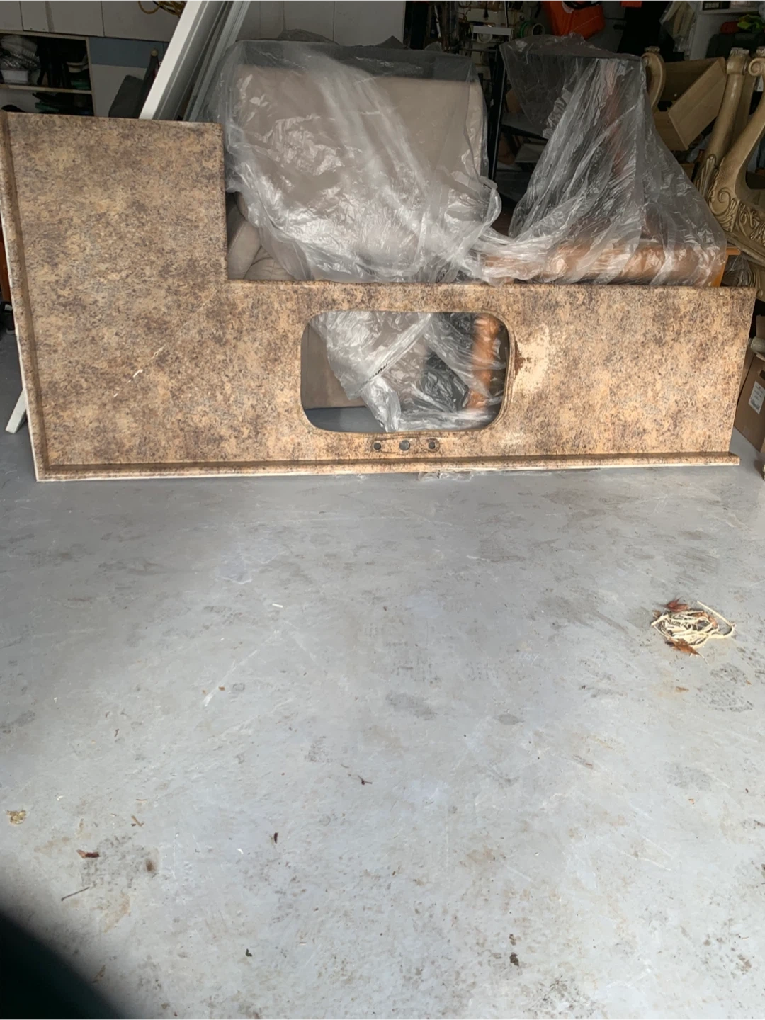 Selling a used countertop with a unique brown pattern. It has a sink cutout and some visible wear. Great for a DIY project or a budget-friendly renovation!