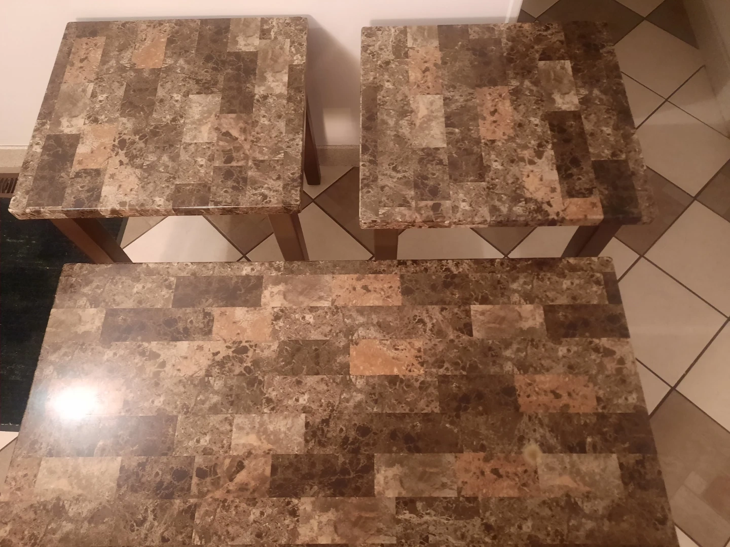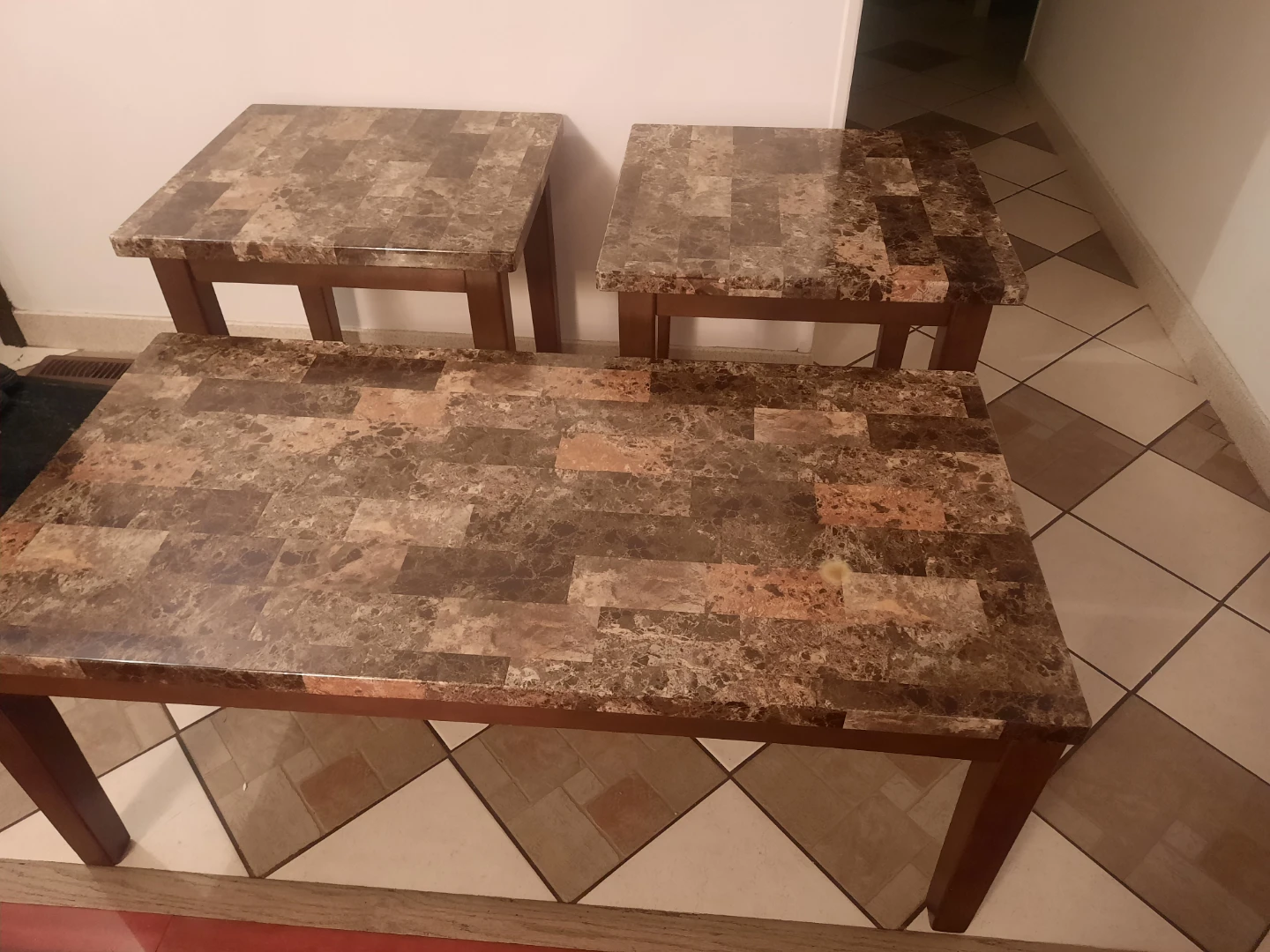 Selling a coffee table set! The set includes a large coffee table and two smaller side tables. They have a faux marble top and wooden legs. Good condition smoke free, pet free home.