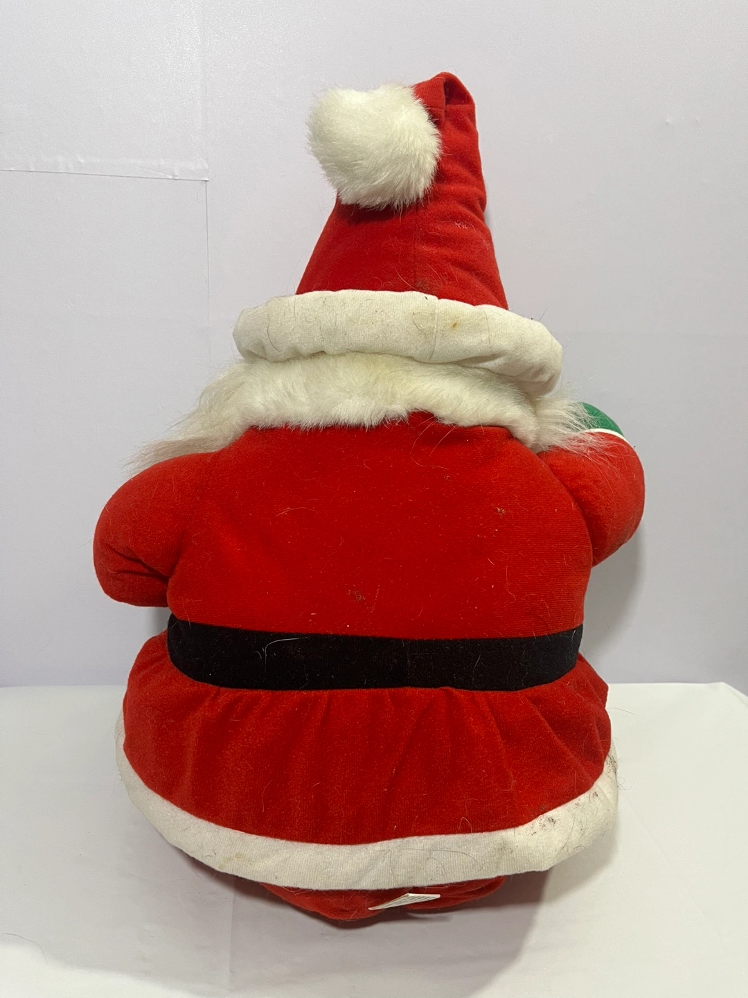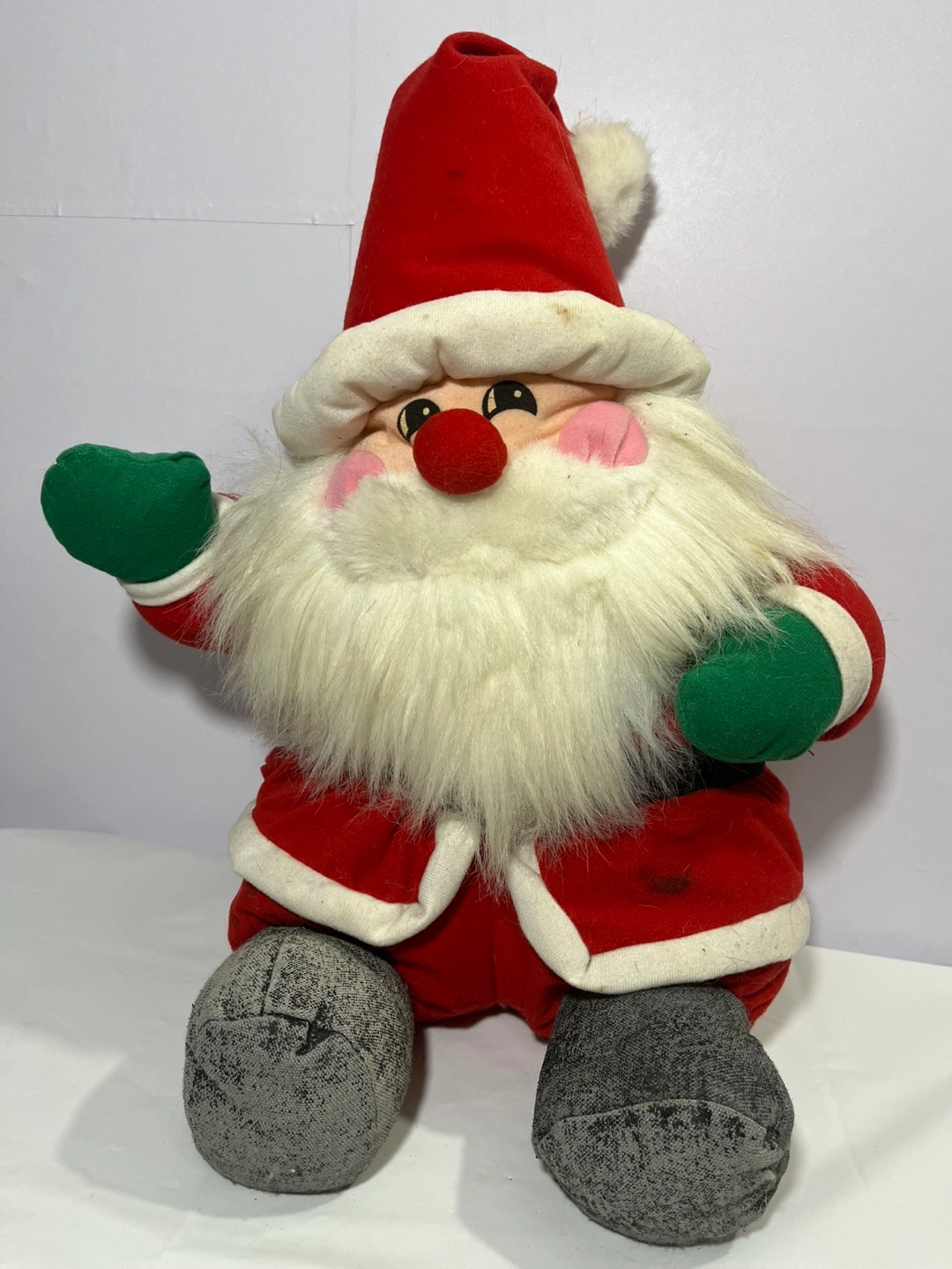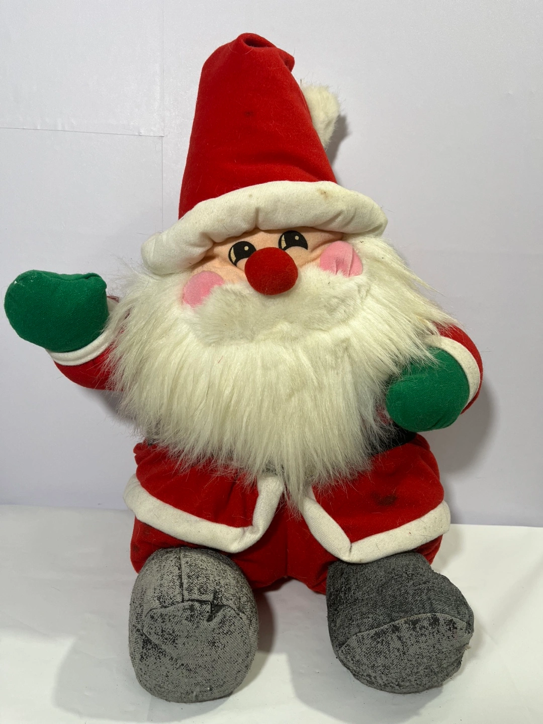 Here's a cute Santa Claus plush toy! It's in good condition and is ready to spread some holiday cheer. It has a red suit, white beard, and green gloves.