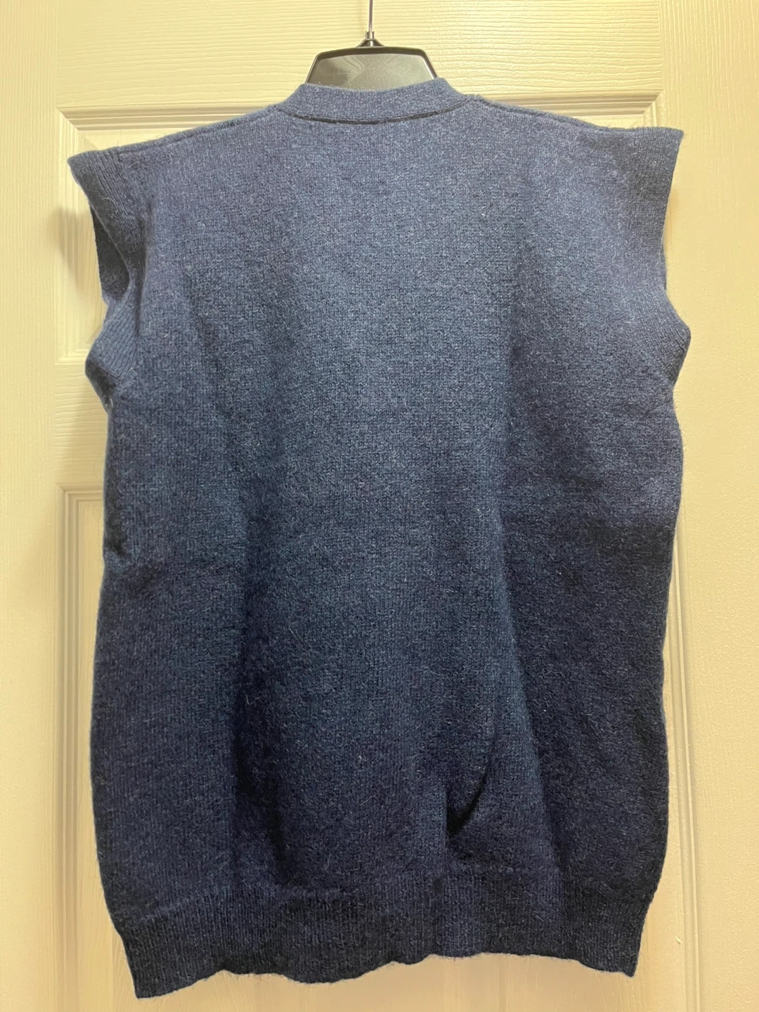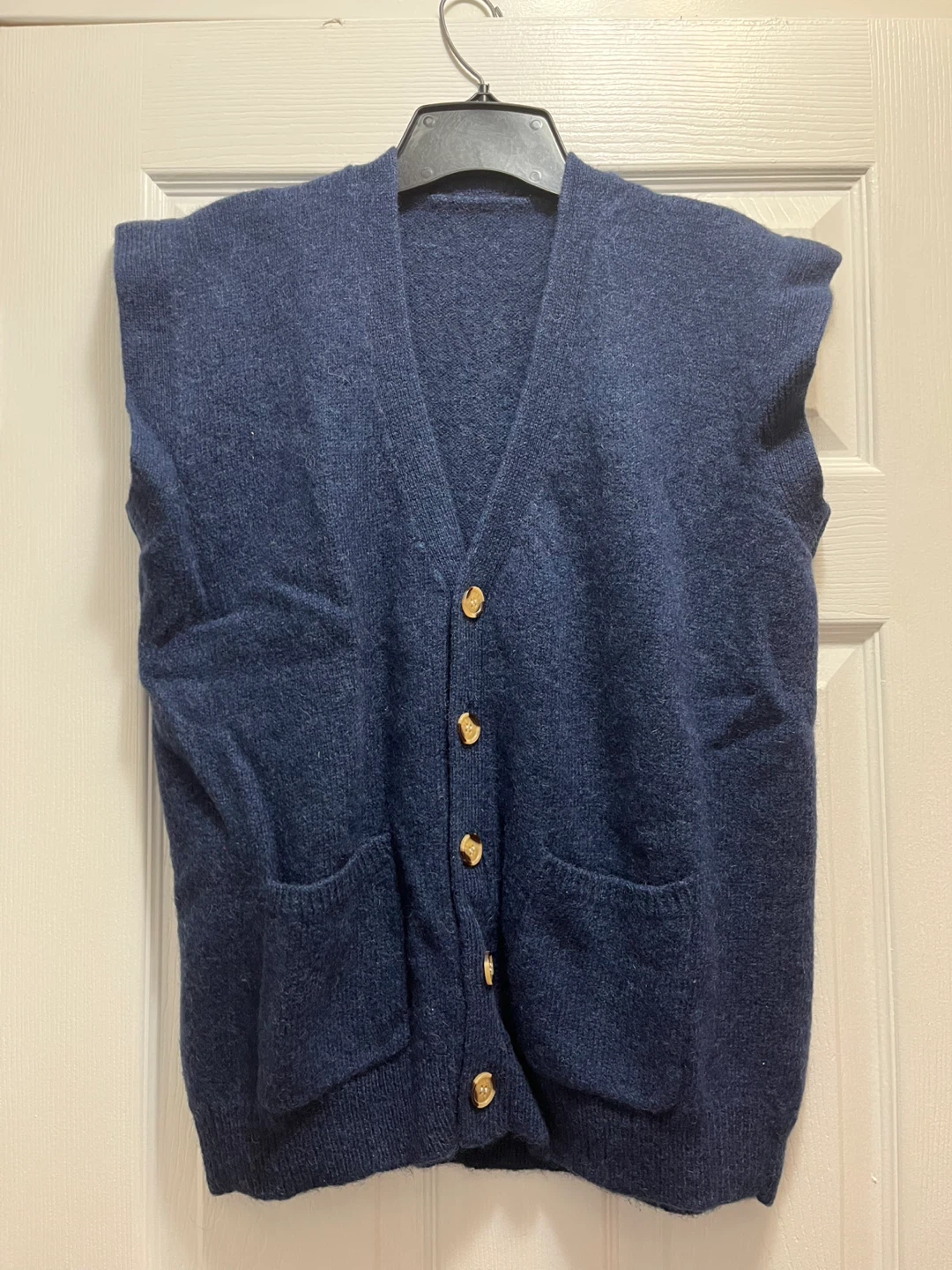 Selling a nice navy blue sleeveless cardigan vest. It has a classic look with functional pockets and button-down front. Made of wool. Perfect for layering during cooler weather!