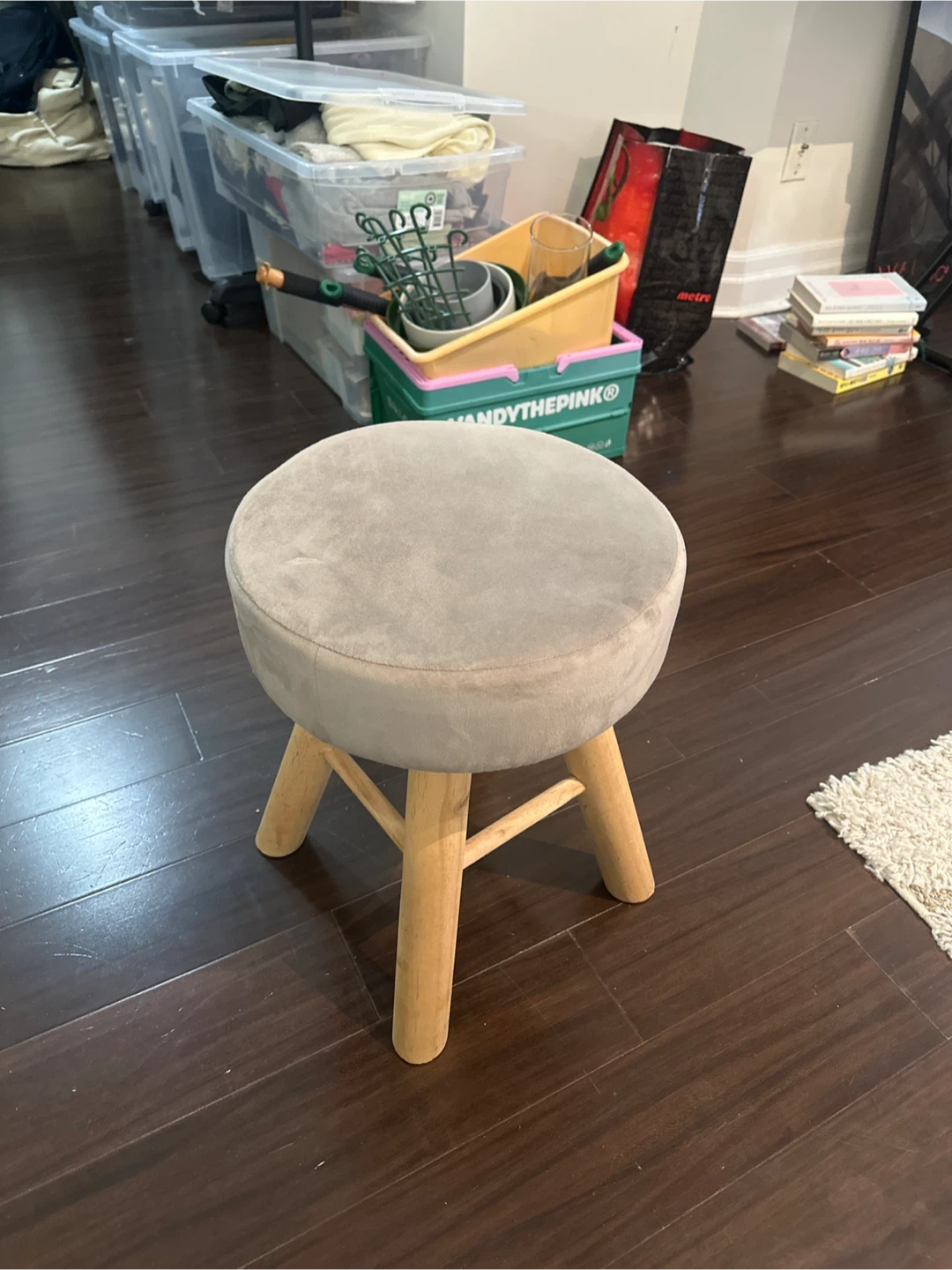 Selling a cute little round stool! It's in great shape and would be perfect as an accent piece or for extra seating. The top is a soft grey and the legs are natural wood. It's quite sturdy!
