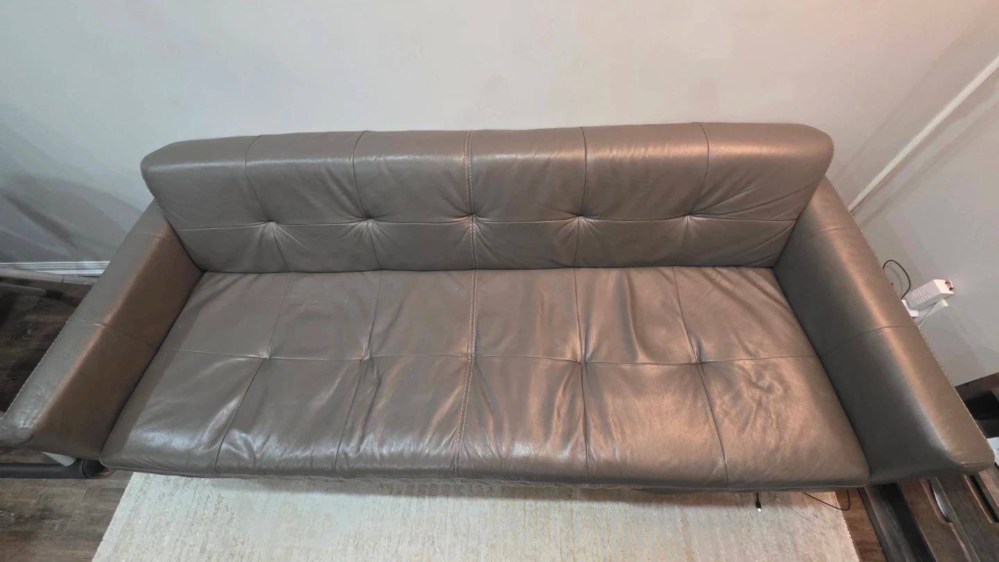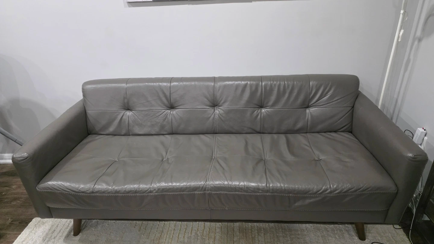 Selling a comfy 3 seater grey leather sofa! It's in great shape and ready for a new living room. Perfect for lounging and adding a touch of style to your space. Cushion is extra firm. Bought from Leons for $2100 - receipt will be shown as proof