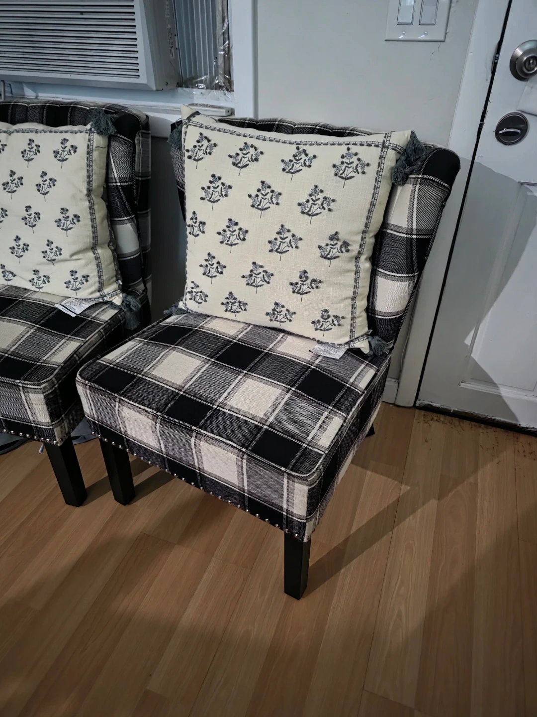 Selling 2 cute accent chair featuring a black and white plaid pattern. They comes with a decorative pillow with a floral design. This 2 chairs would be a great addition to any room!