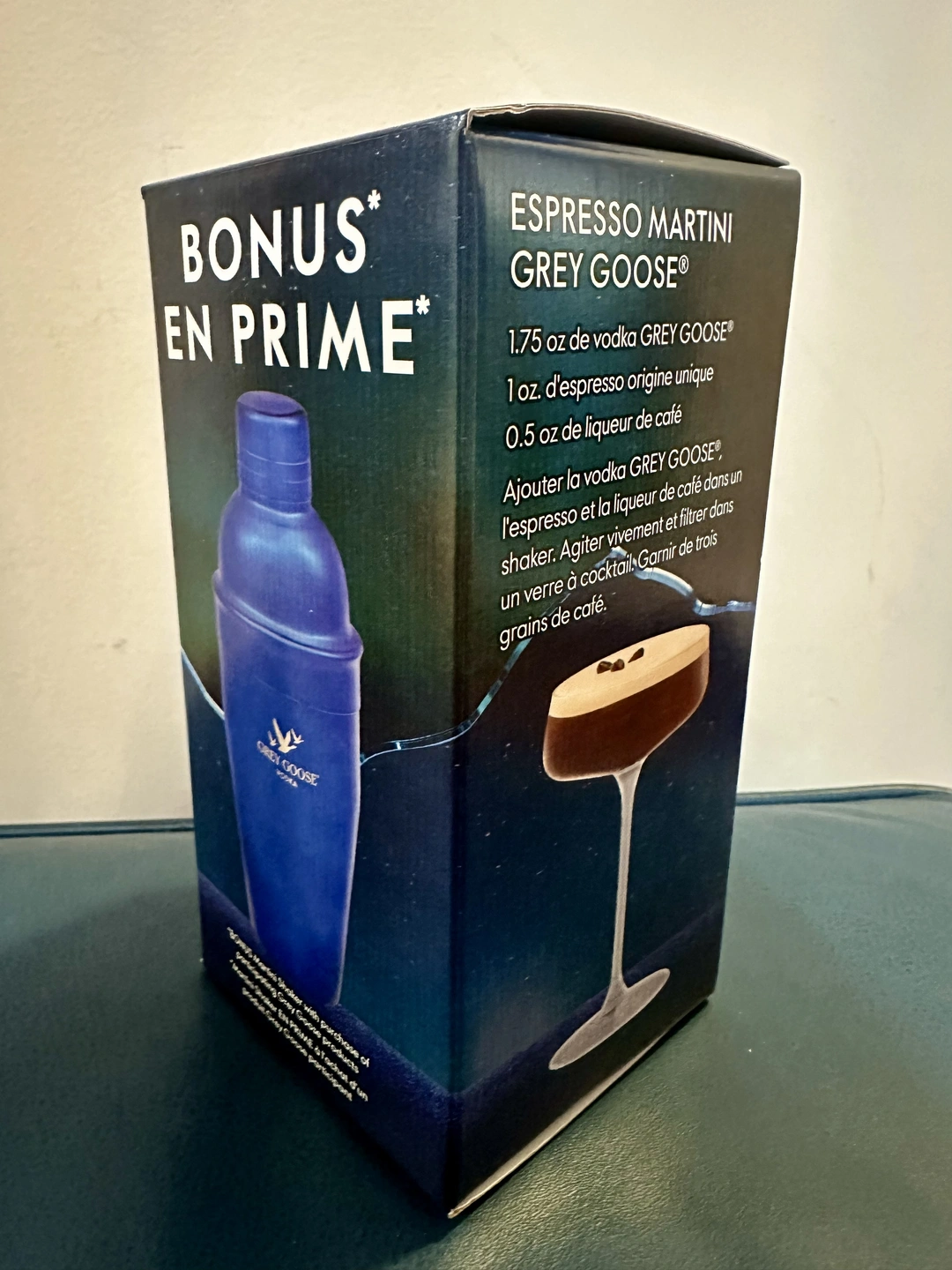 Brand new in box Metallic Blue Grey Goose espresso martini cocktail shaker and recipe.