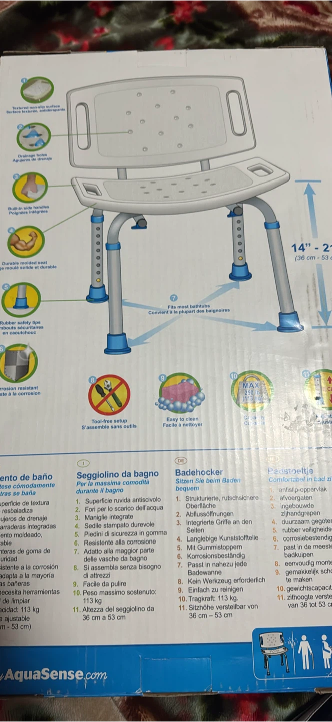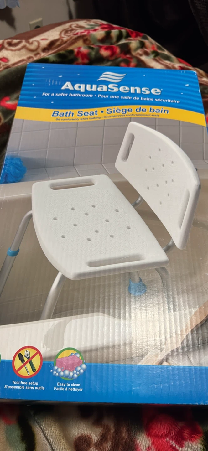 Selling an AquaSense bath seat, designed for a safer bathing experience. It's in great condition and comes with the original box. The seat is adjustable from 14 to 21 inches (36 to 53 cm) to fit most bathtubs. It's also tool-free setup and easy to clean