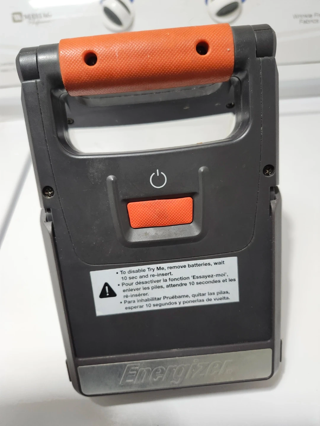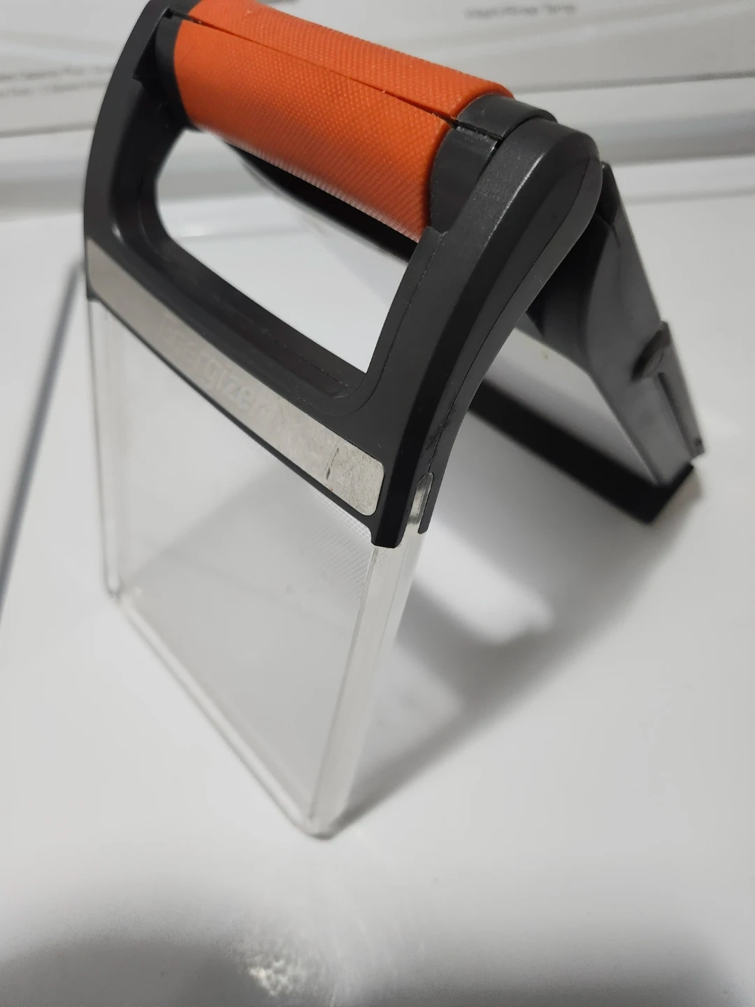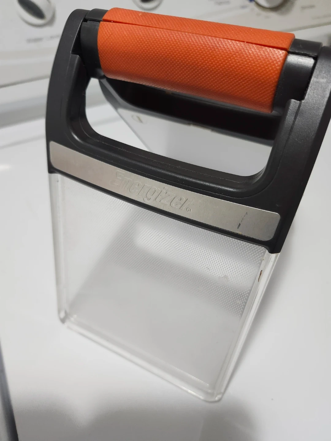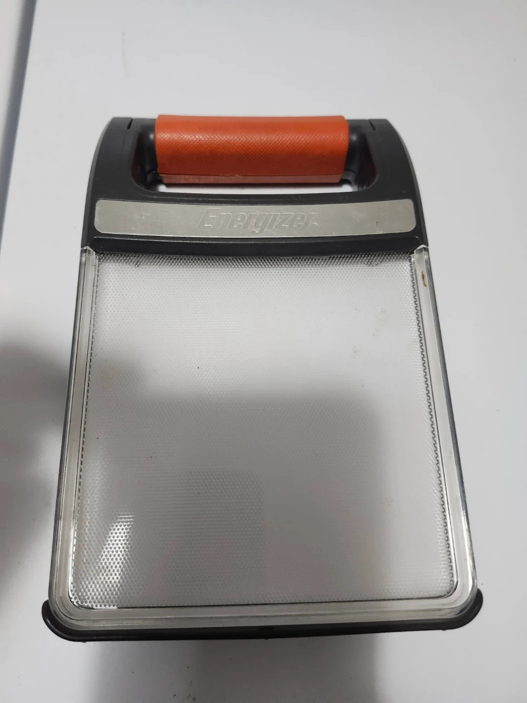Selling an Energizer LED folding lantern! It features a convenient orange handle and a clear plastic cover. The lantern can be folded for easy storage and portability. It's perfect for camping, power outages, or any situation where you need a reliable light source