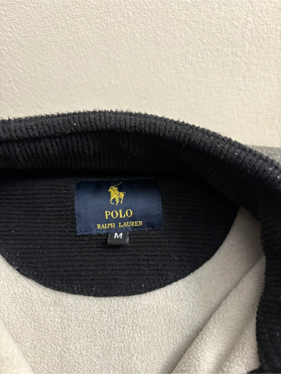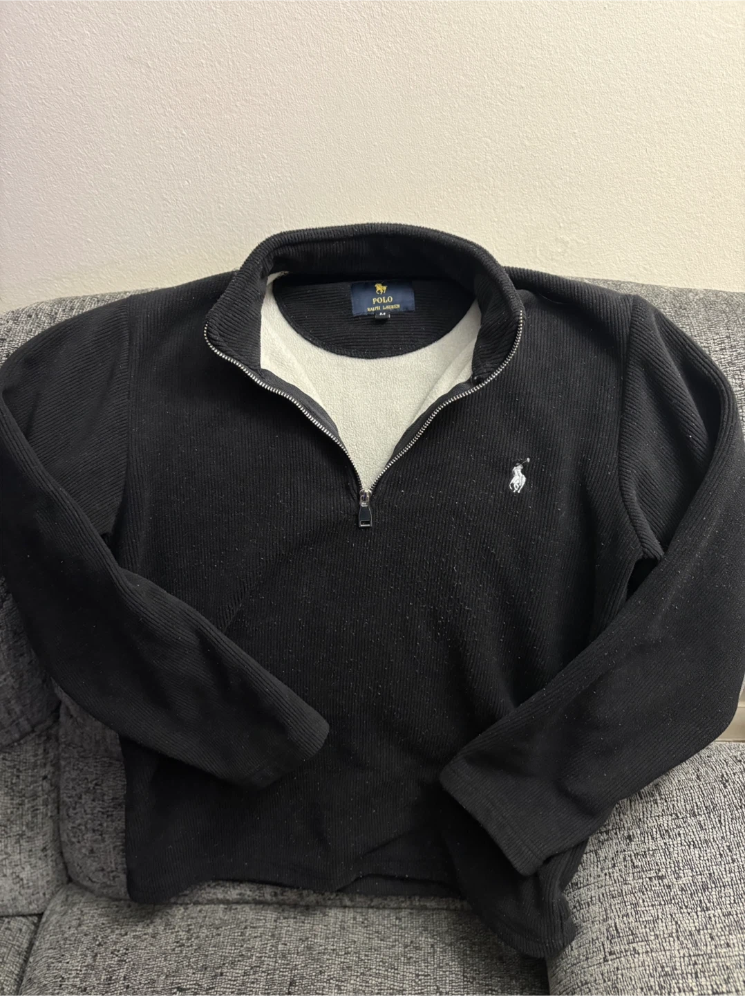 Selling a Polo Ralph Lauren pullover in black. It's a size medium and in great condition. The material is soft and comfortable, perfect for layering! The classic Polo logo is embroidered on the chest.