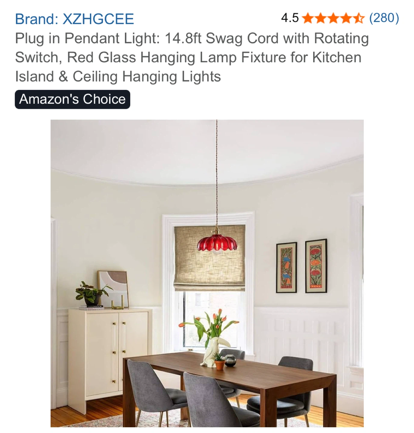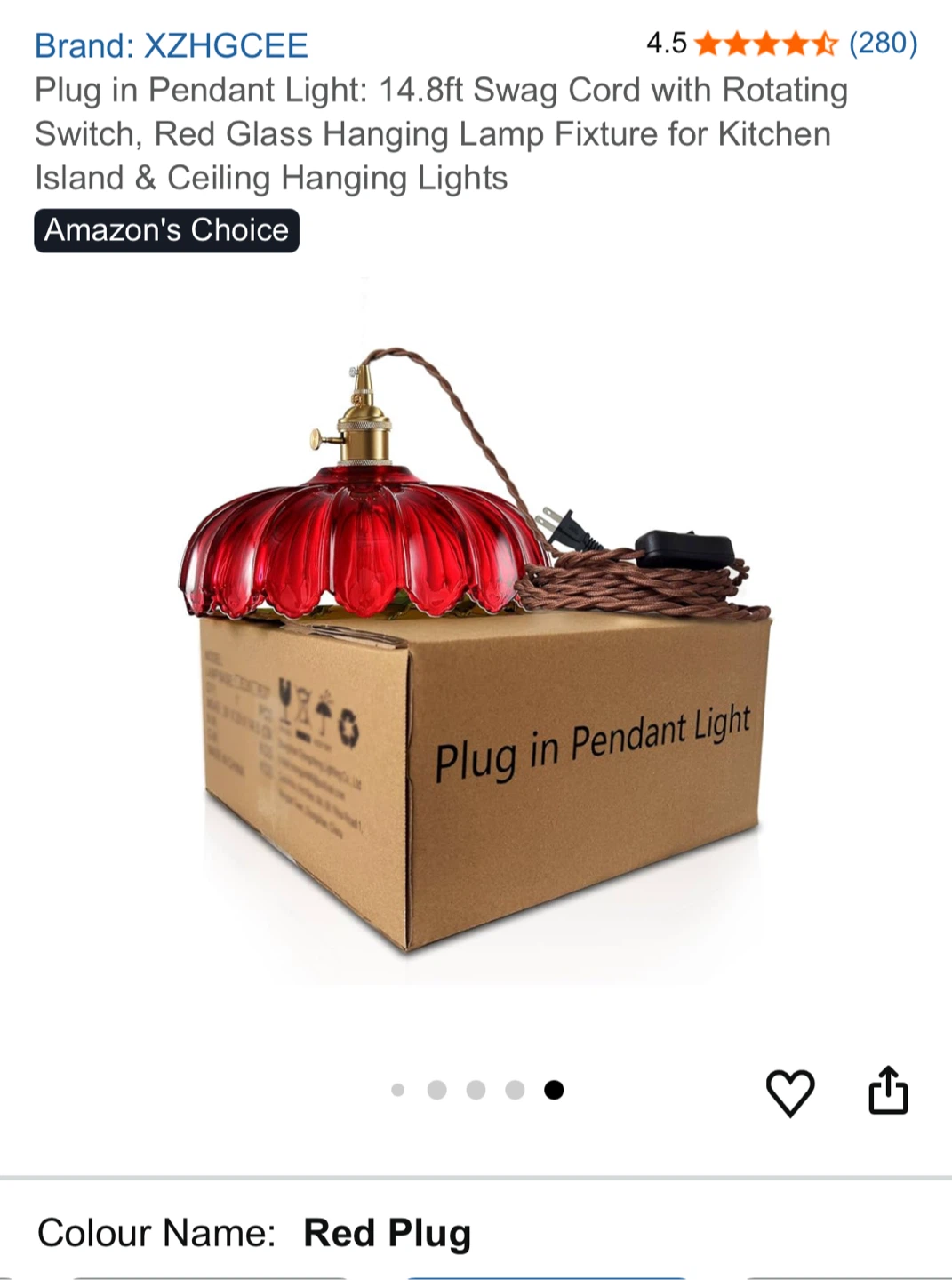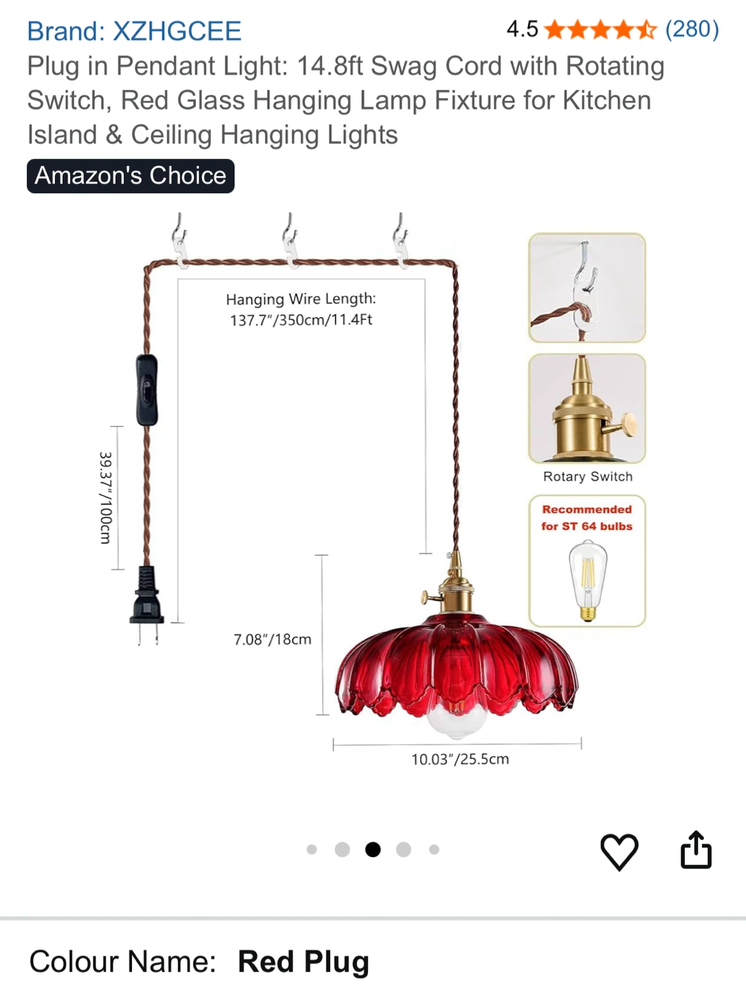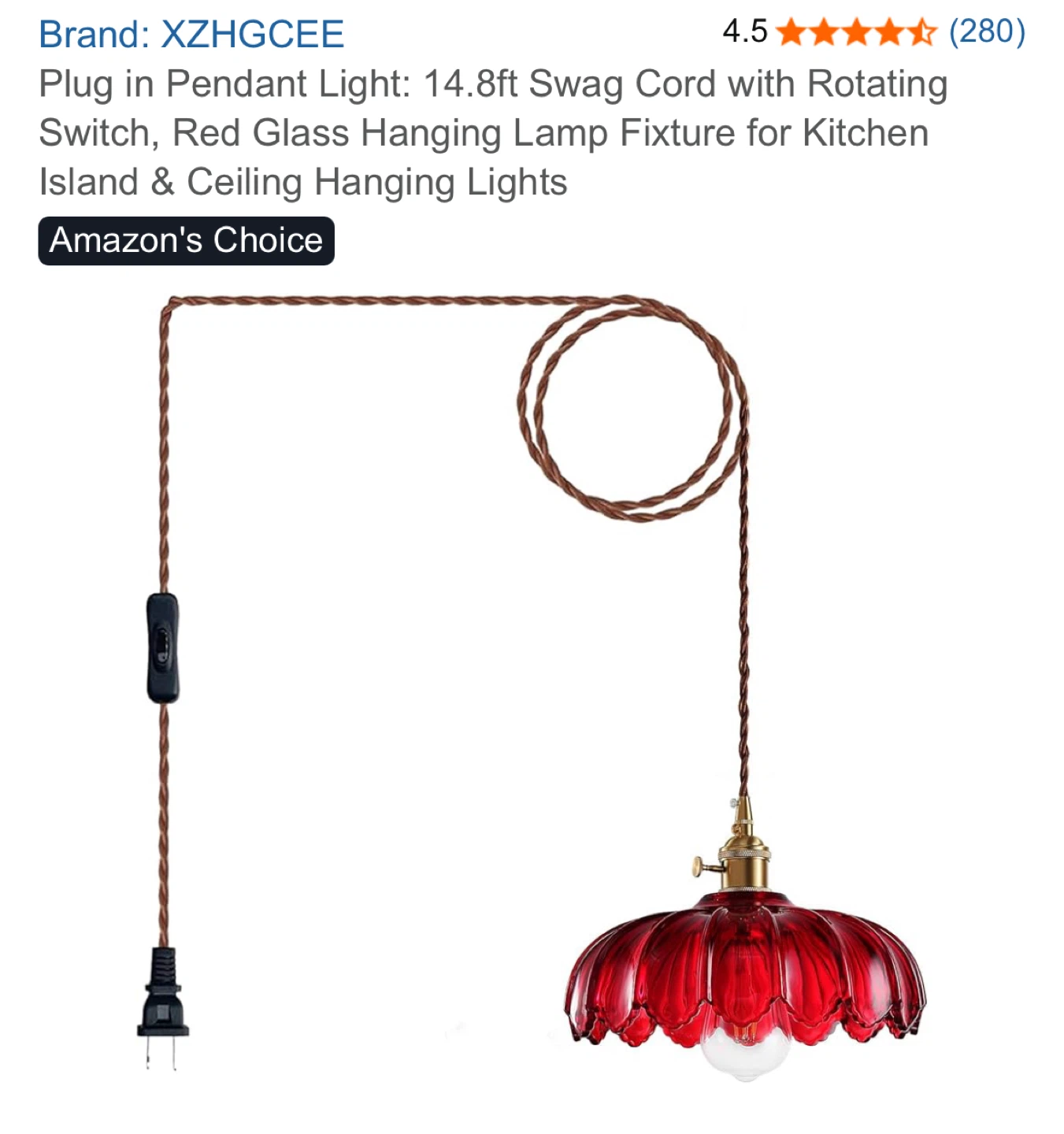 Check out this XZHGCEE plug-in pendant light! It features a 14.8ft swag cord with a rotating switch. The red glass hanging lamp fixture is perfect for a kitchen island or as ceiling hanging lights. Hanging wire length: 137.7''/350cm/11.4ft