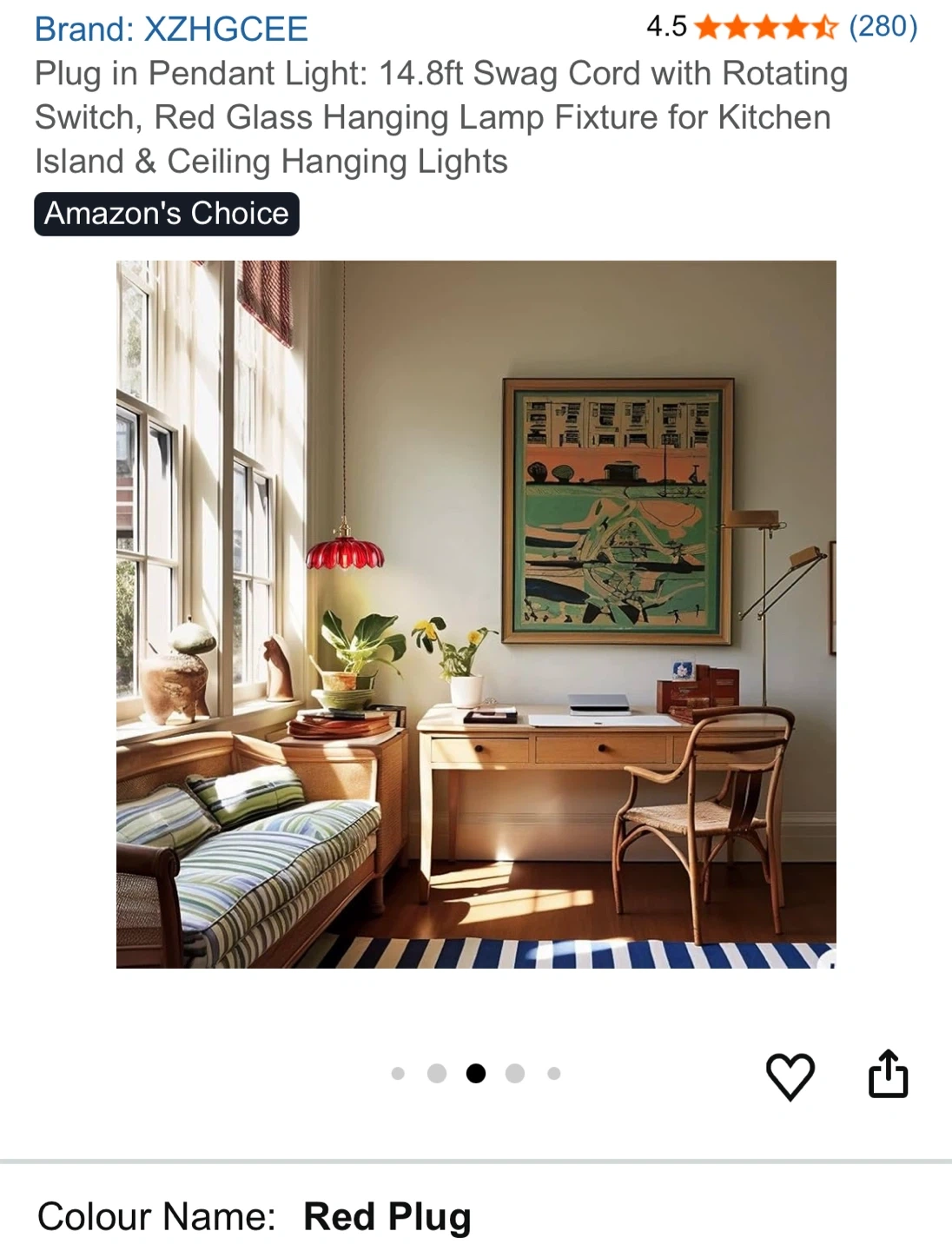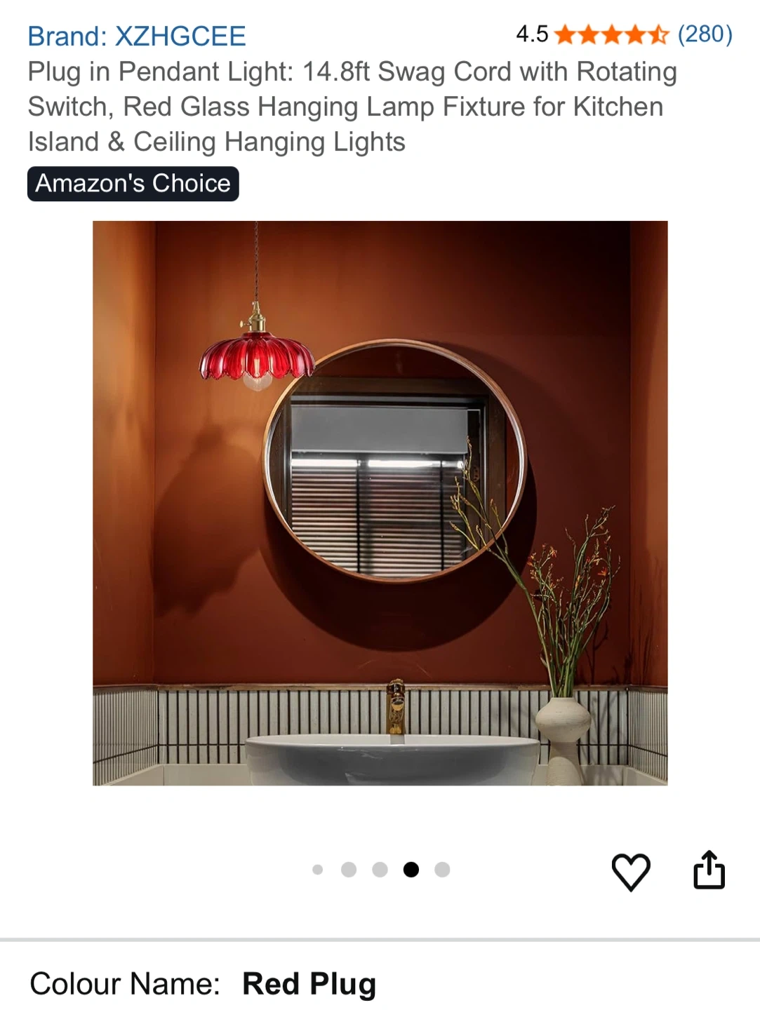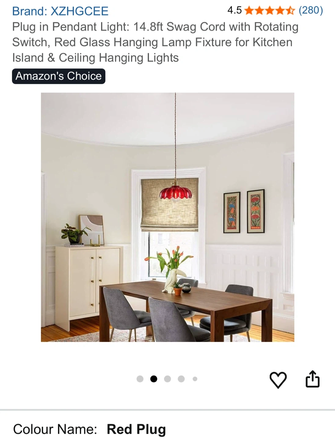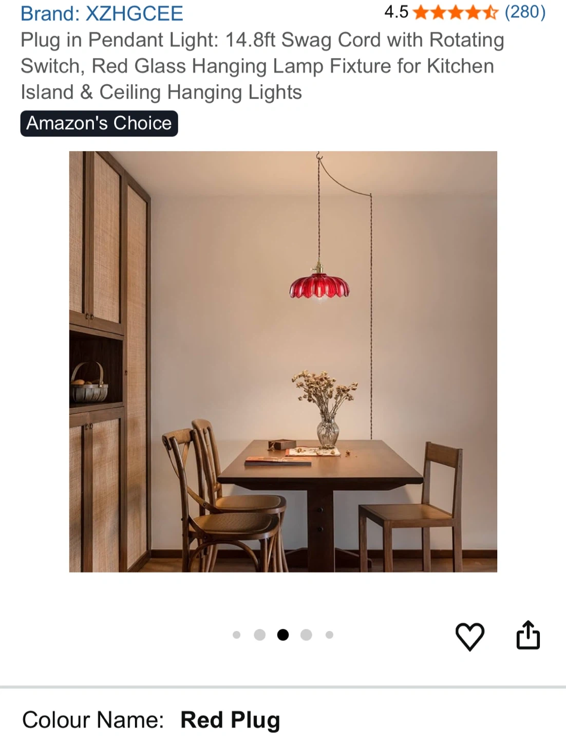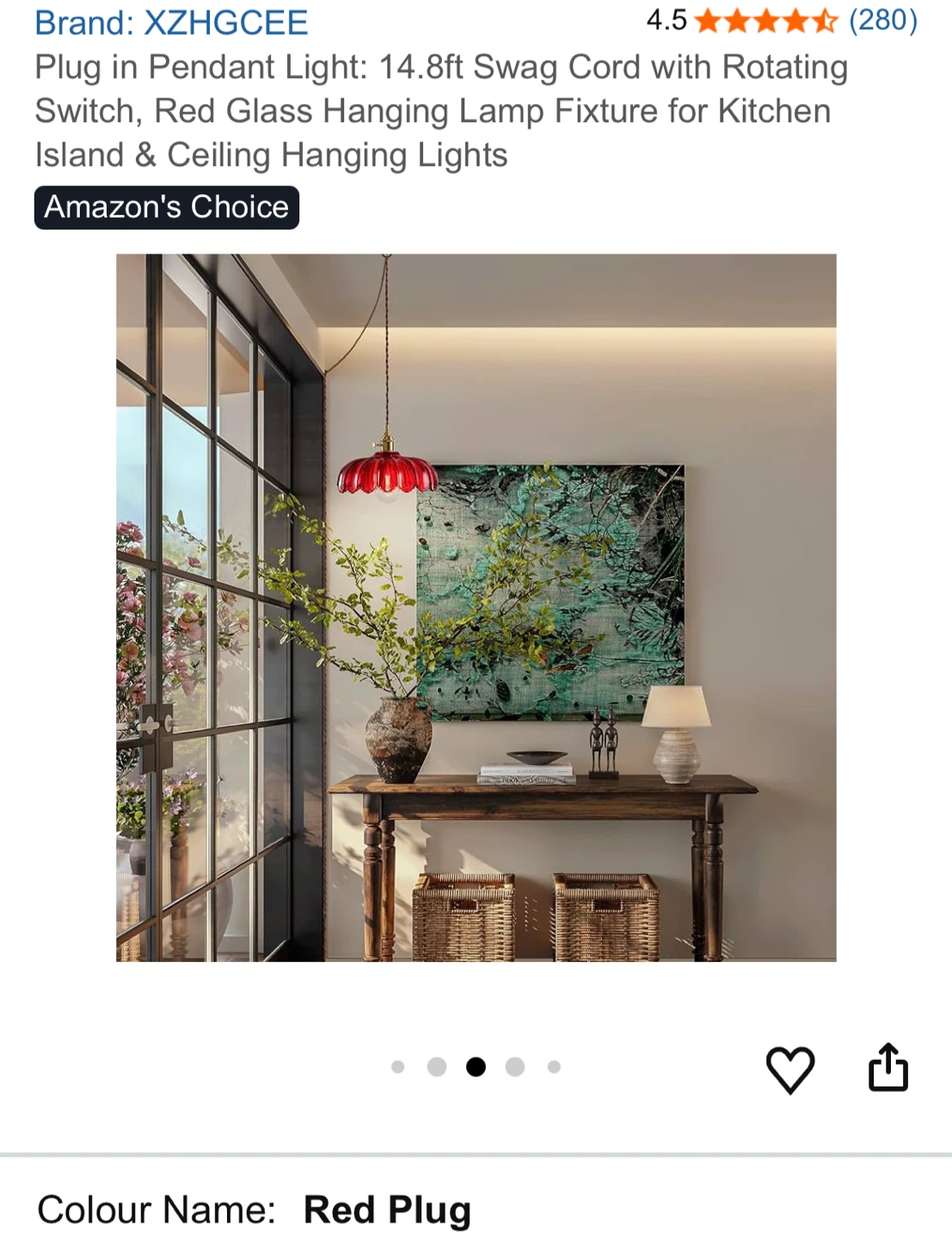 Check out this XZHGCEE plug-in pendant light! It features a 14.8ft swag cord with a rotating switch. The red glass hanging lamp fixture is perfect for a kitchen island or as ceiling hanging lights. Hanging wire length: 137.7''/350cm/11.4ft
