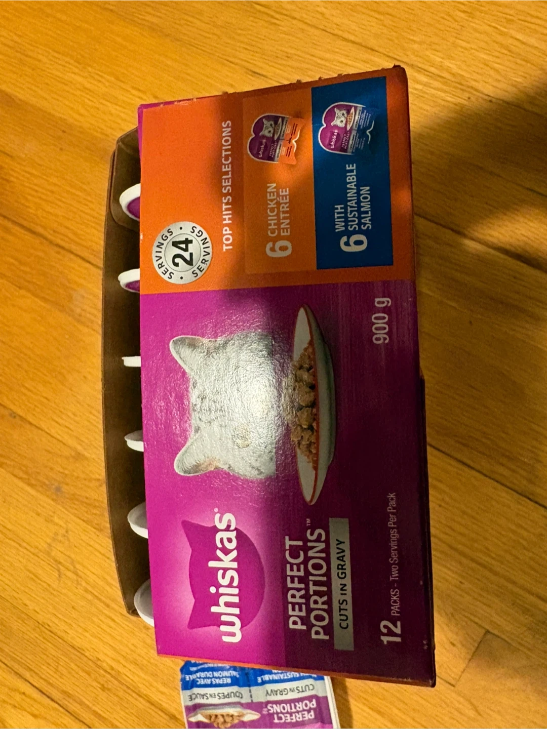- Whiskas Perfect Portions Cuts in Gravy, Top Hits Selections with Chicken Entree and Sustainable Salmon (900g box with 12 portions)