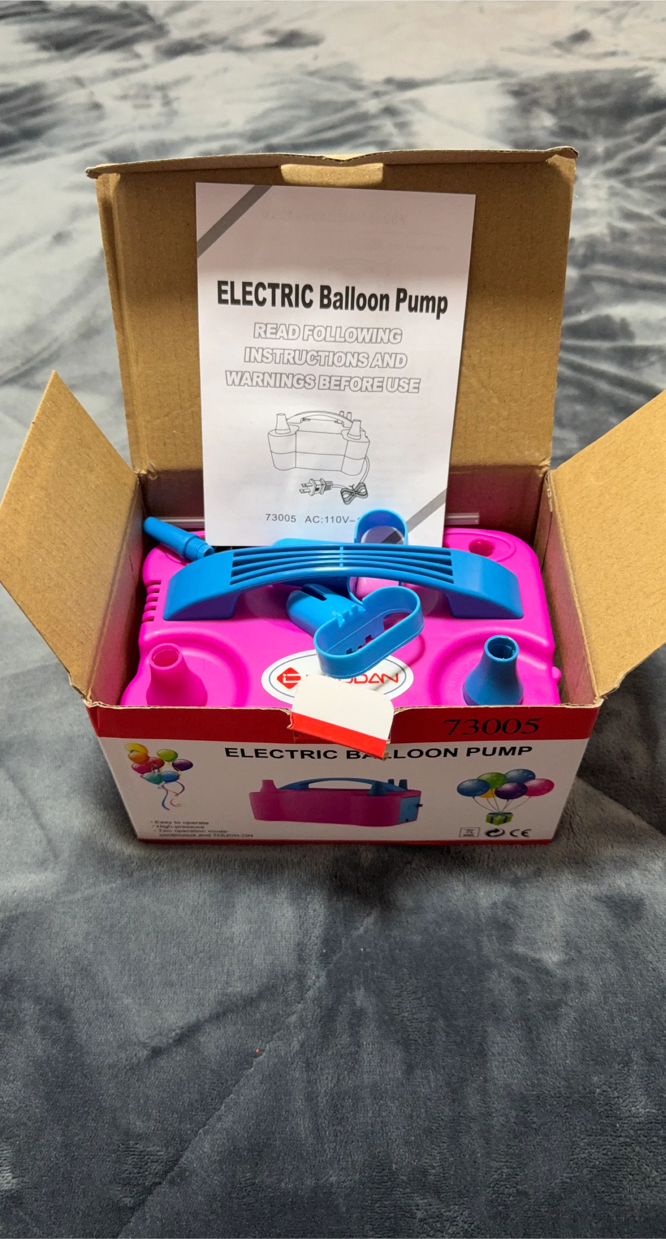I'm selling a brand new electric balloon pump, still in its original box! It's pink and blue, and super easy to operate. The box includes the instructions and warnings, so you'll be all set to go. Perfect for parties and events!