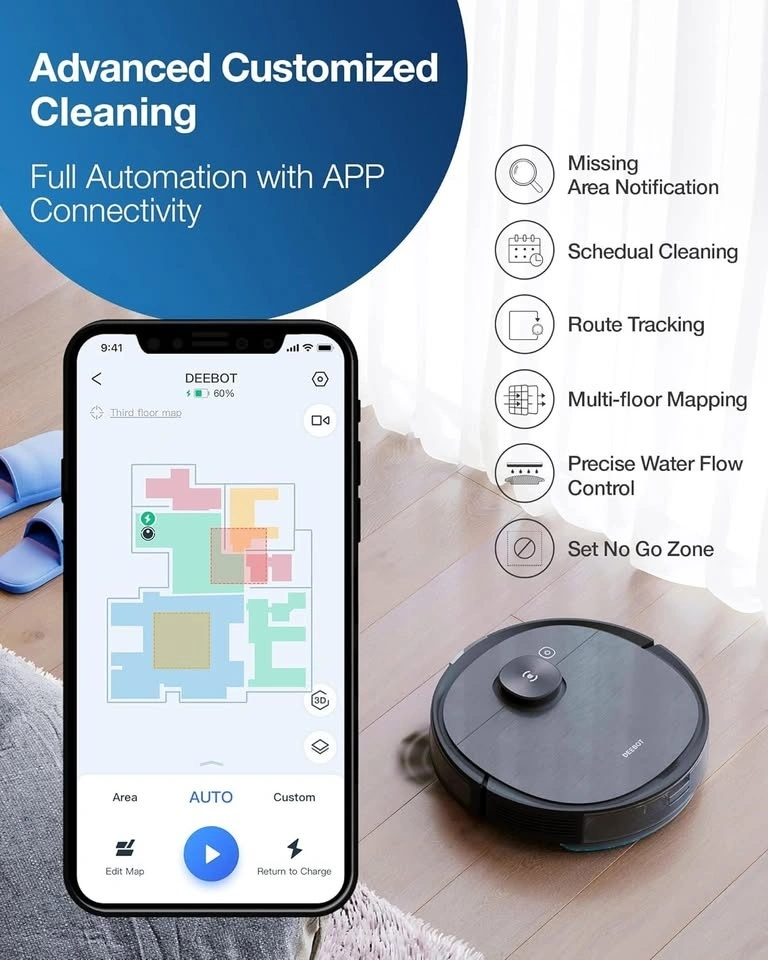 Powerful custom cleaning: With ECOVACS App, you can divide or merge areas, label rooms, set cleaning sequence, choose different cleaning times, vacuum power, water flow level for different areas. You can also set no-go zones and no-mop zones so that certain areas will not be cleaned or mopped.