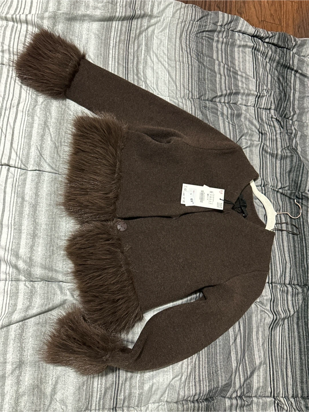Selling a Zara cardigan with faux fur trim! It's a size small and in excellent condition. The colour is a lovely dark brown. Originally bought for $69.90