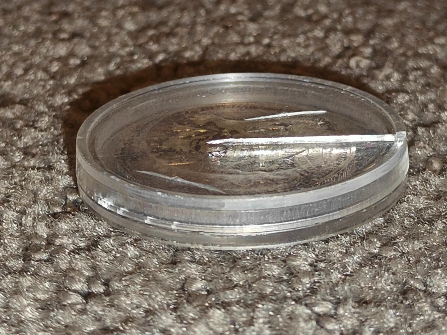 * Case: The original clear acrylic capsule has a crack, and the black leatherette outer case shows some wear.