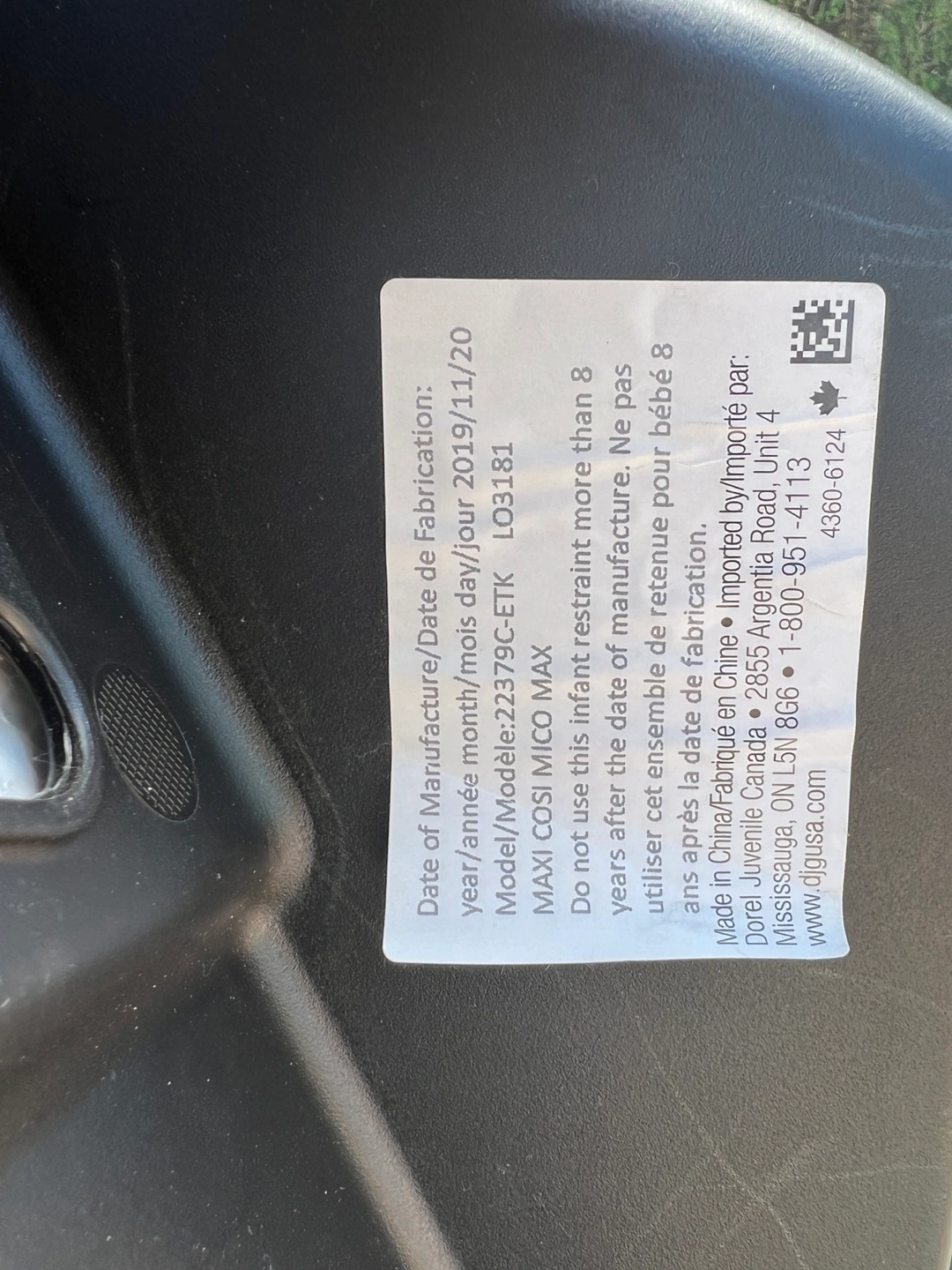 Carseat manufactured in NOV 2019
