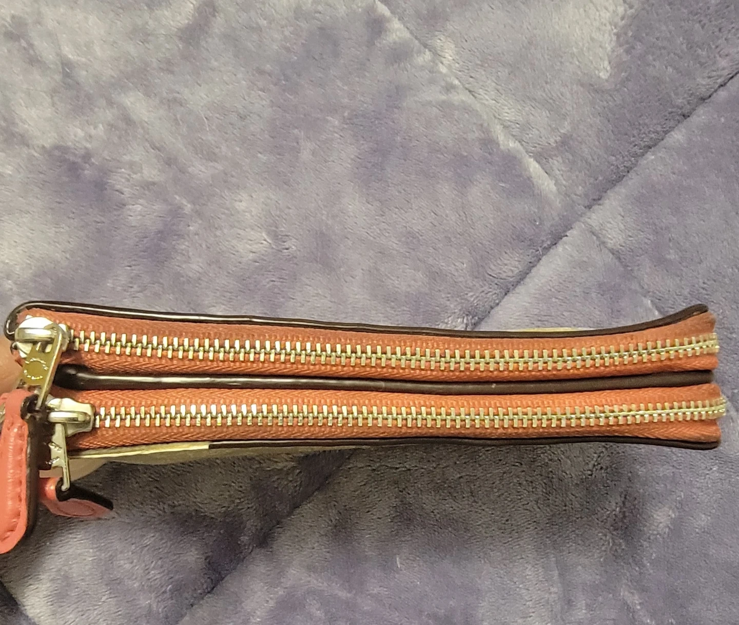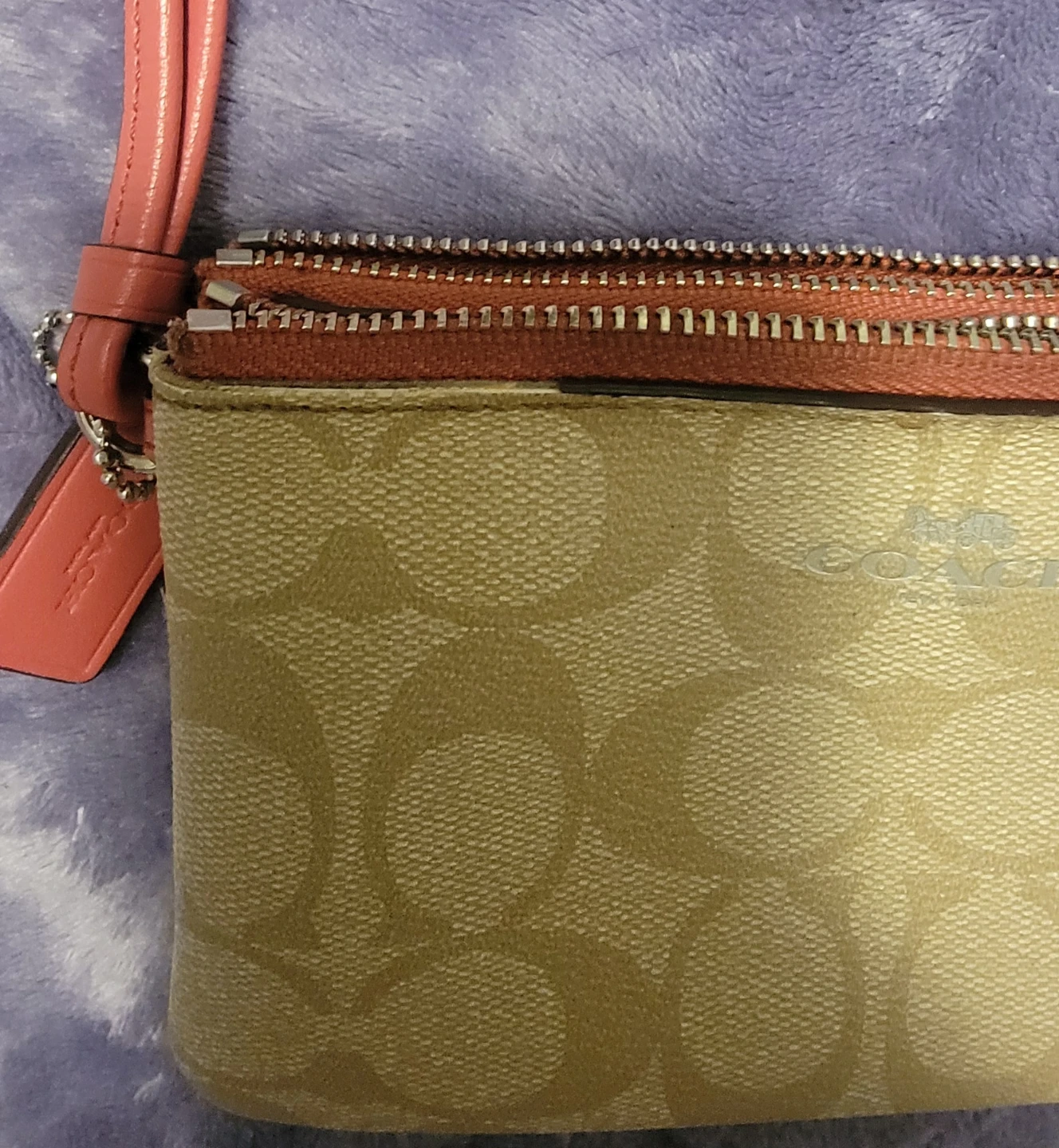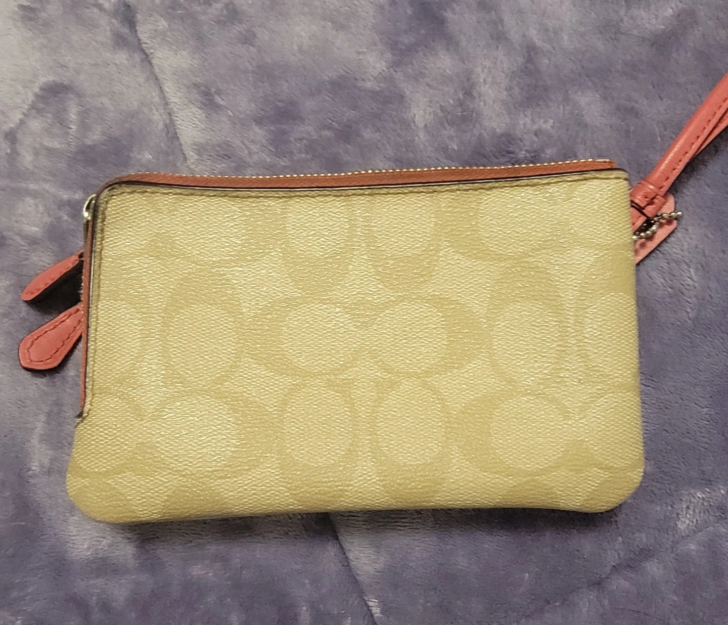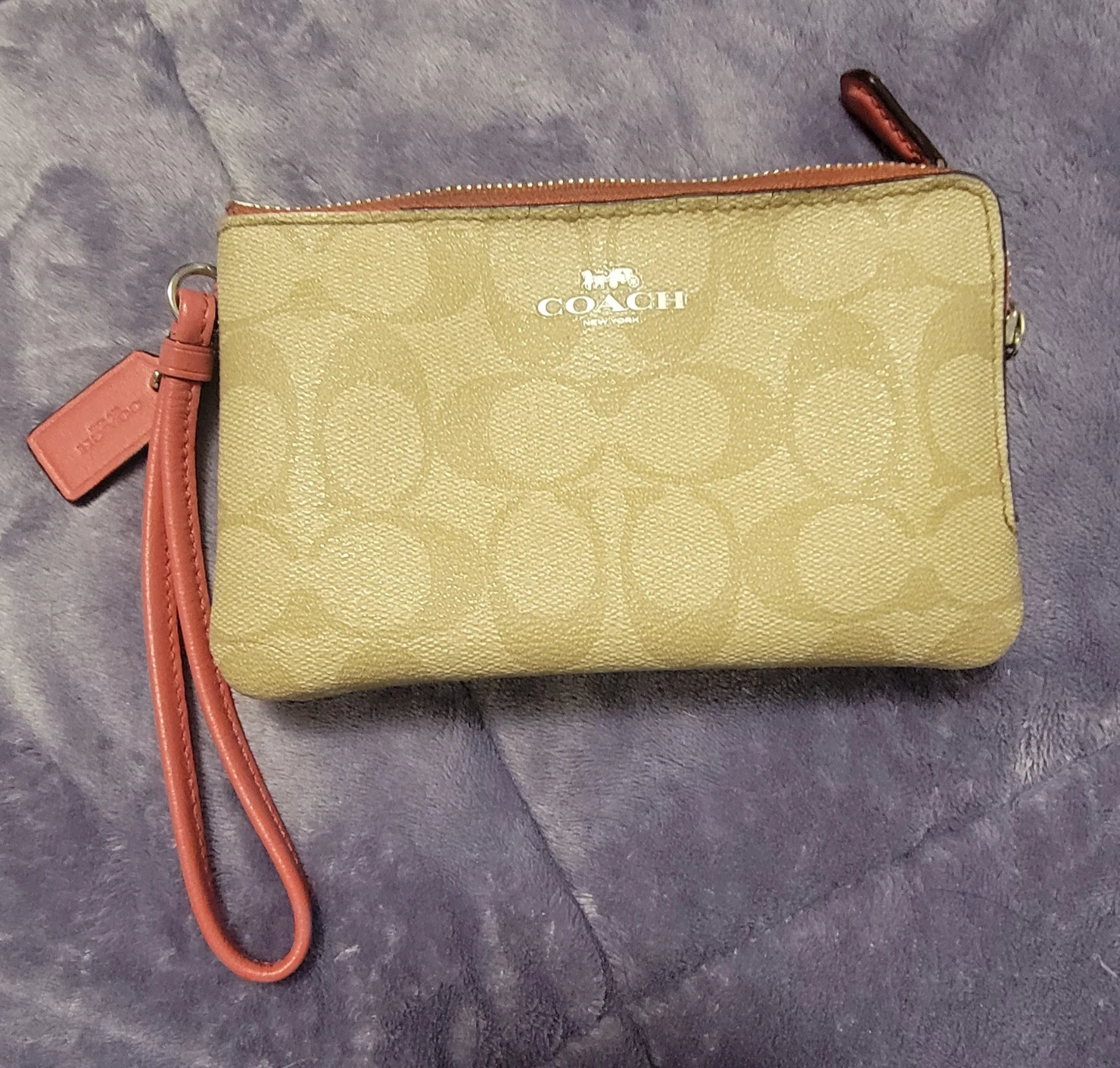 Selling a cute Coach wristlet! It features the classic Coach logo pattern and a coral-coloured wrist strap. Perfect for carrying your essentials!
