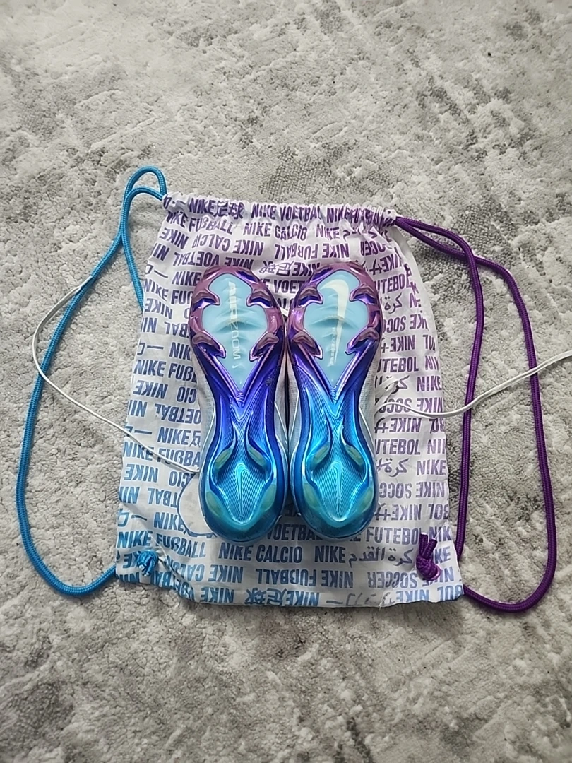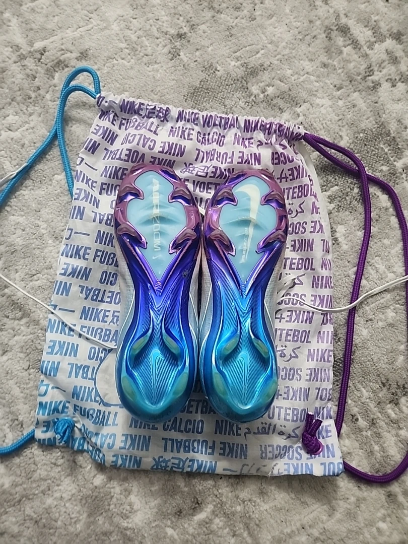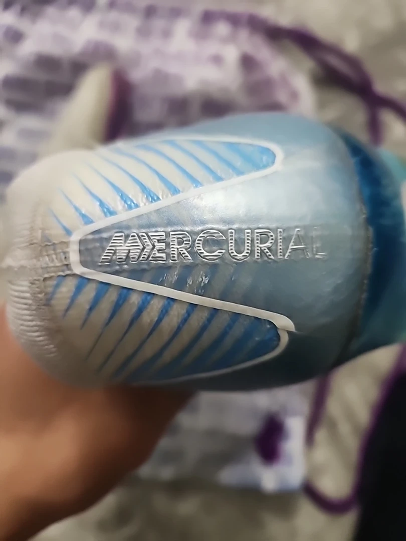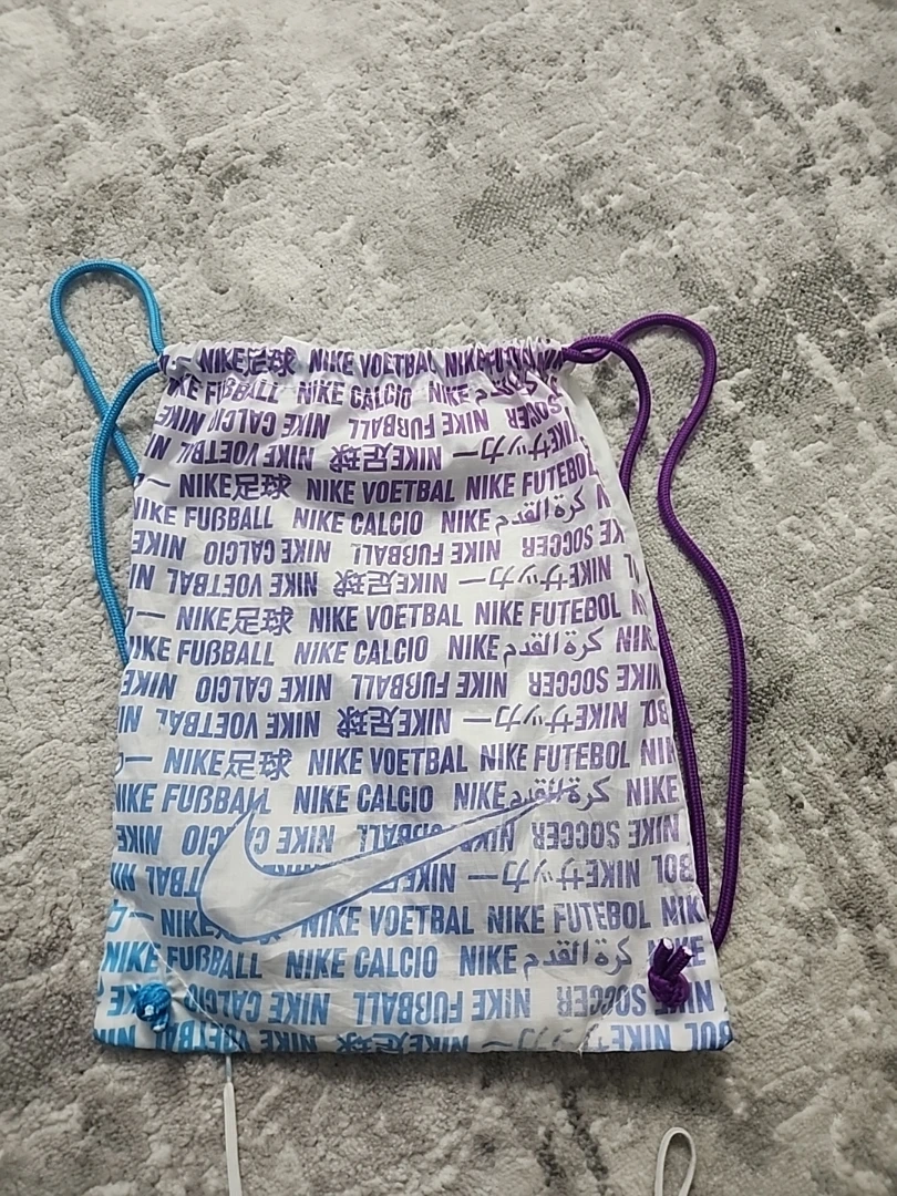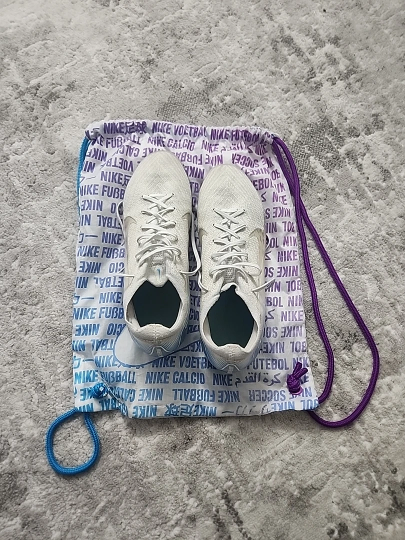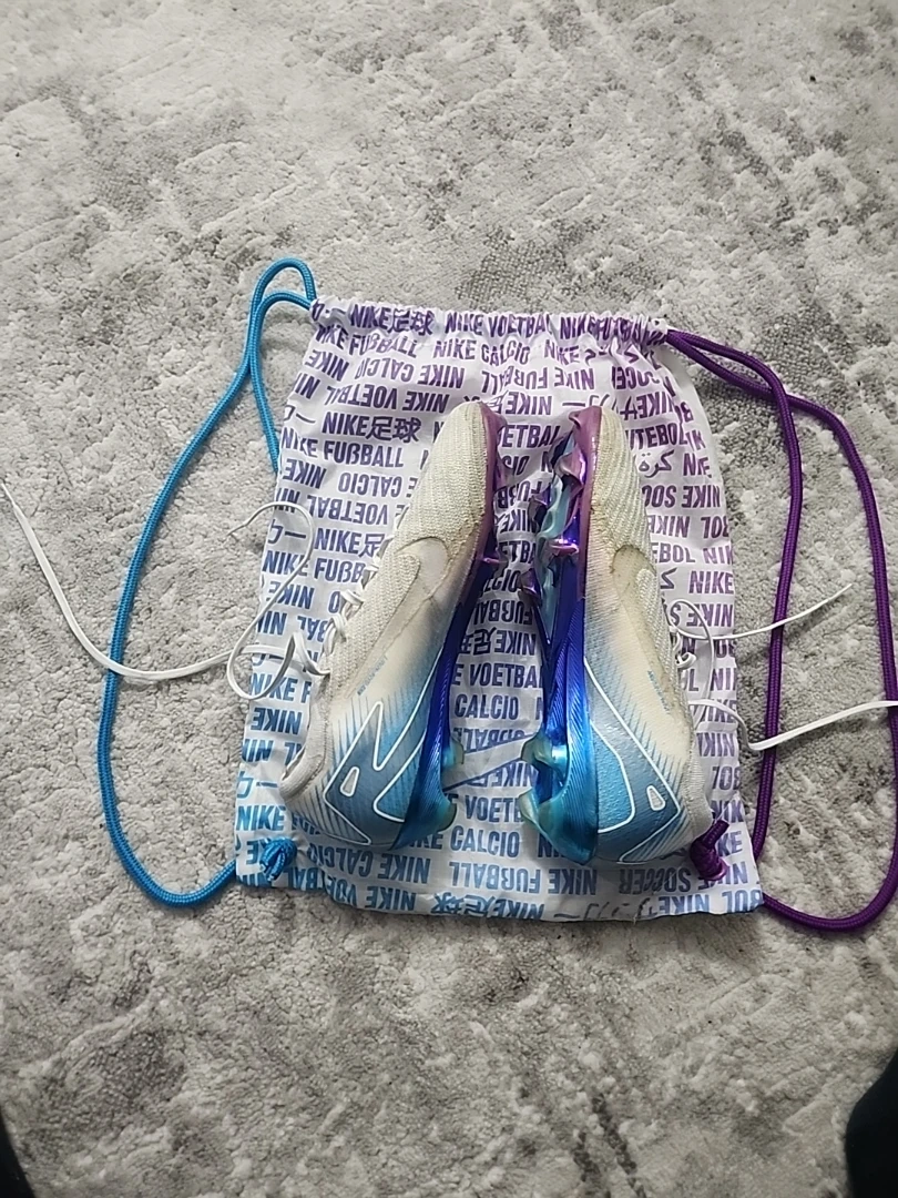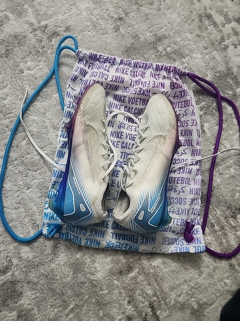 Selling a pair of Nike Mercurial Special edition football cleats. They come with a drawstring bag. The cleats feature a unique colour combination of white, blue, and purple. Great for playing on the field!