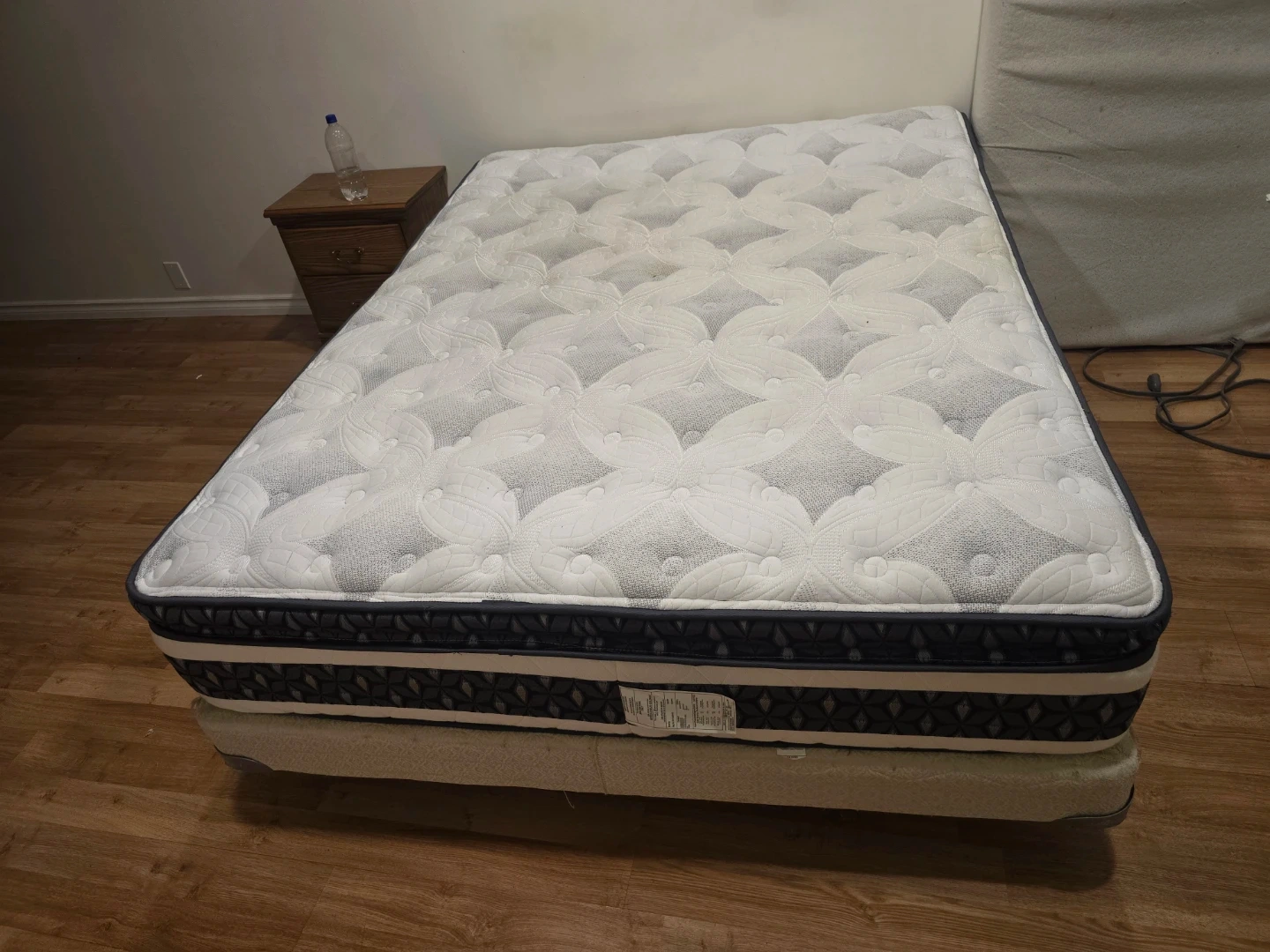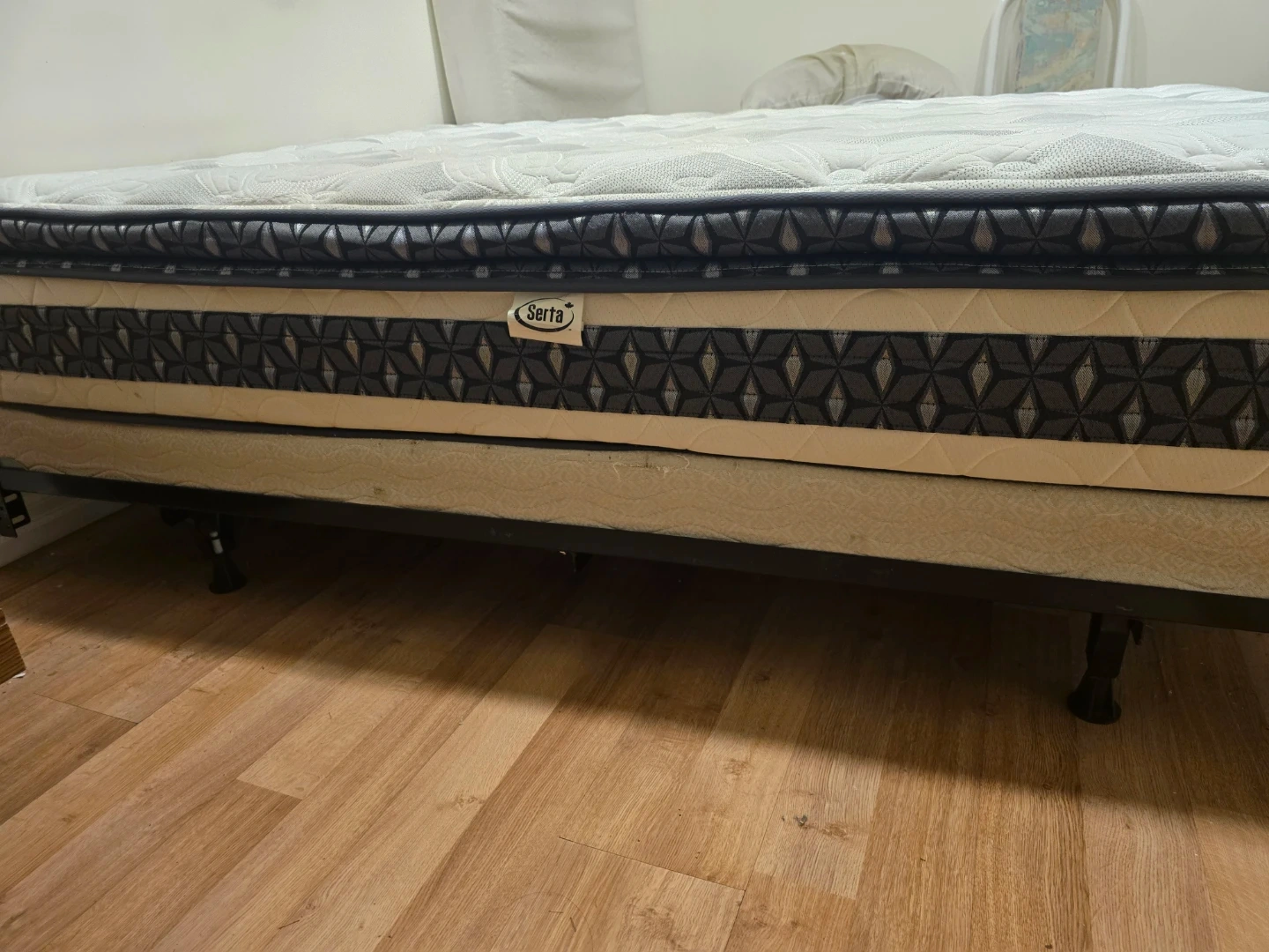 Selling a used queen size Serta mattress. It has a white and grey patterned top with a dark blue trim. Queen With bed frame Perfect for a good night's sleep!