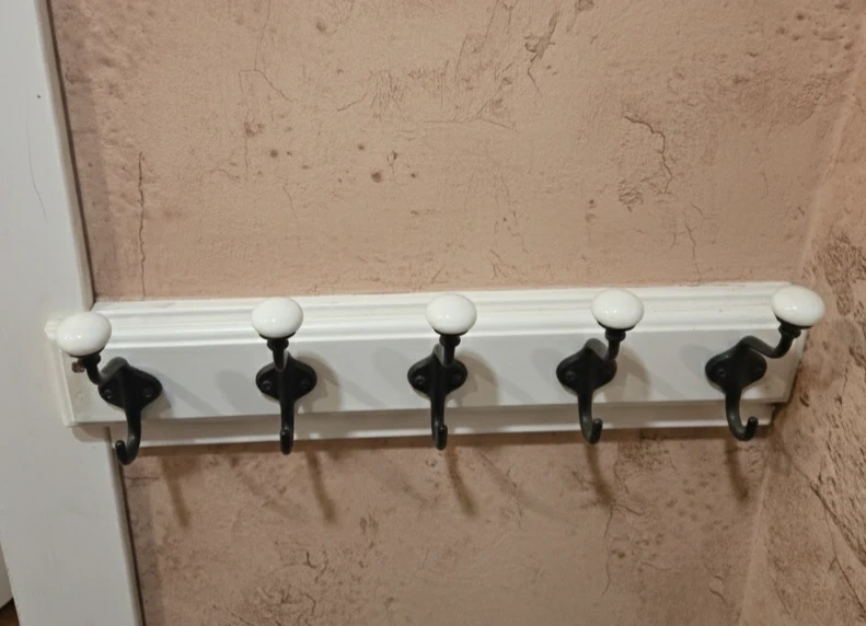 Here's a coat rack featuring five sturdy hooks, perfect for tidying up your entryway or closet. It's a classic design that will complement any decor!