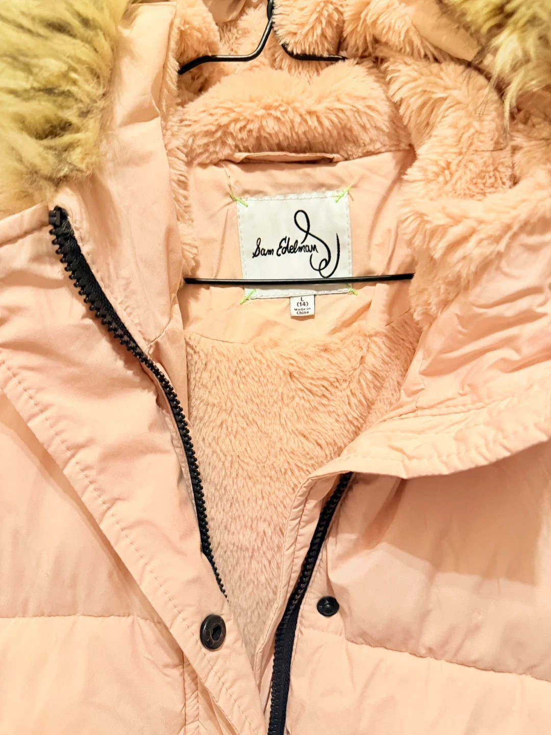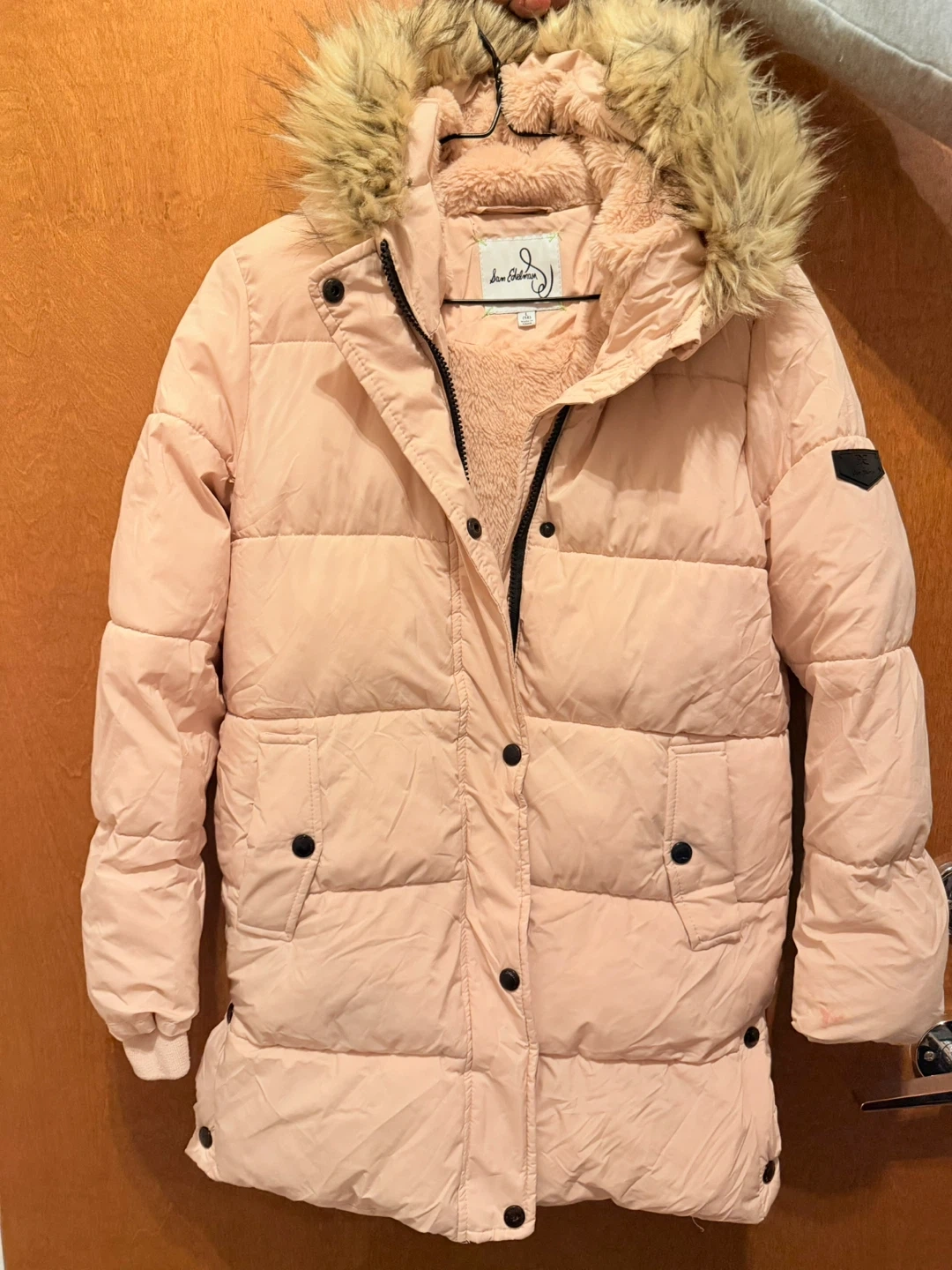 Selling a Sam Edelman puffer jacket in a lovely light pink colour. It's a size 14 and features a faux fur trim on the hood. Perfect for staying warm and stylish! Light pink