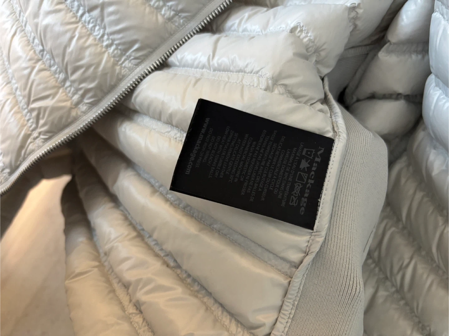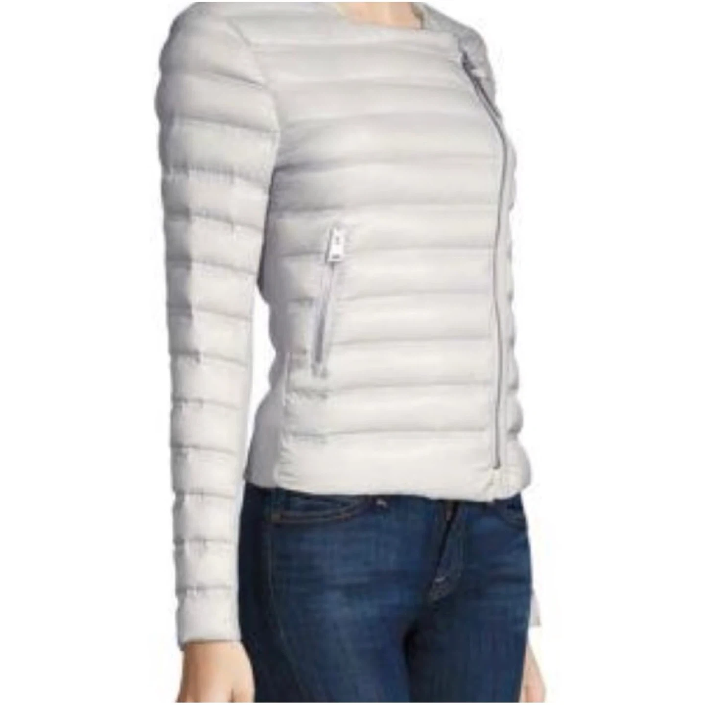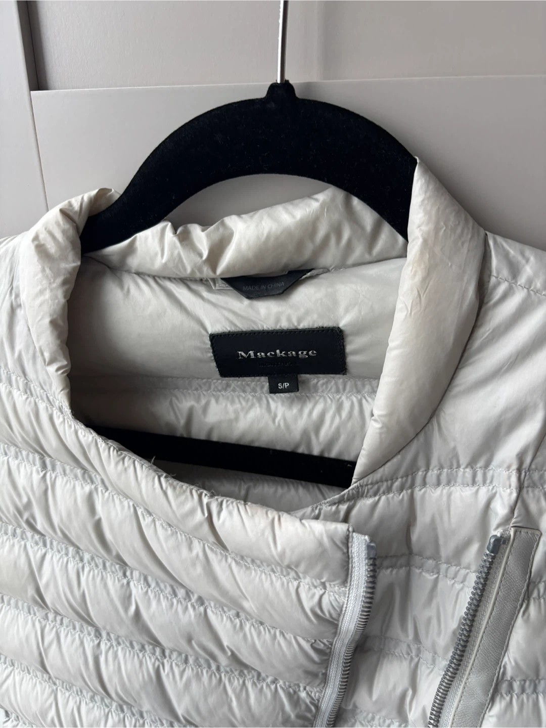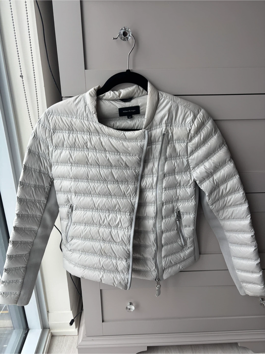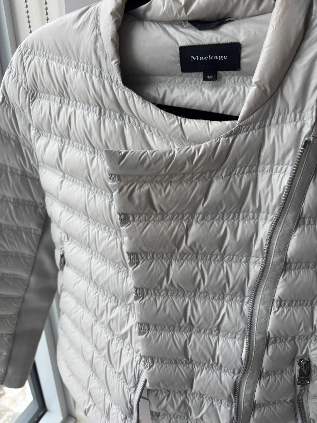 Selling a gently used Mackage Ulana lightweight down jacket in size small. It's a stylish and comfortable jacket, perfect for transitional weather. The asymmetrical zip closure and quilted design give it a modern look. There are some slight signs of wear, but overall it's in good condition!
