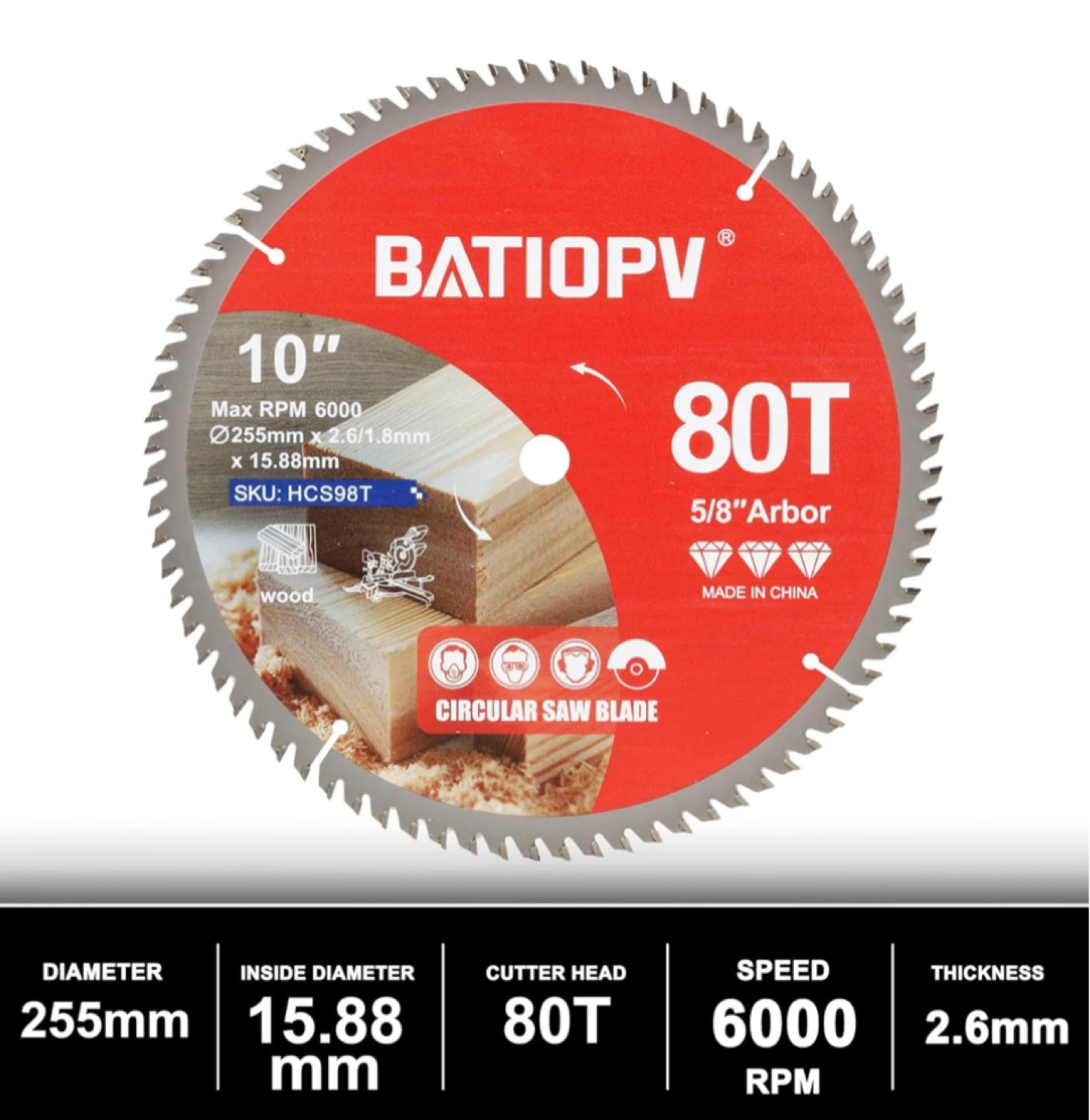 Selling a BATIOPV 10" circular saw blade with 80 teeth! It's designed for cutting through materials like hardwood, plywood, cork, and particleboard. The blade has a diameter of 255mm and an inside diameter of 15.88mm. It's optimized with tooth geometry for a qualitative cut and ideal cutting effect!