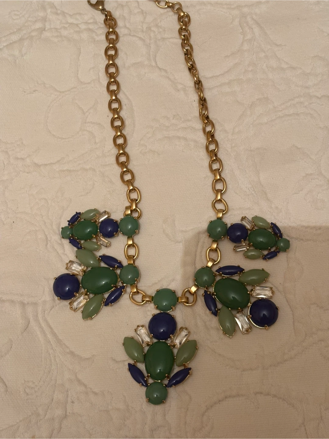 This is a J. Crew statement necklace with green and blue stones. It's perfect for adding a pop of colour to any outfit!