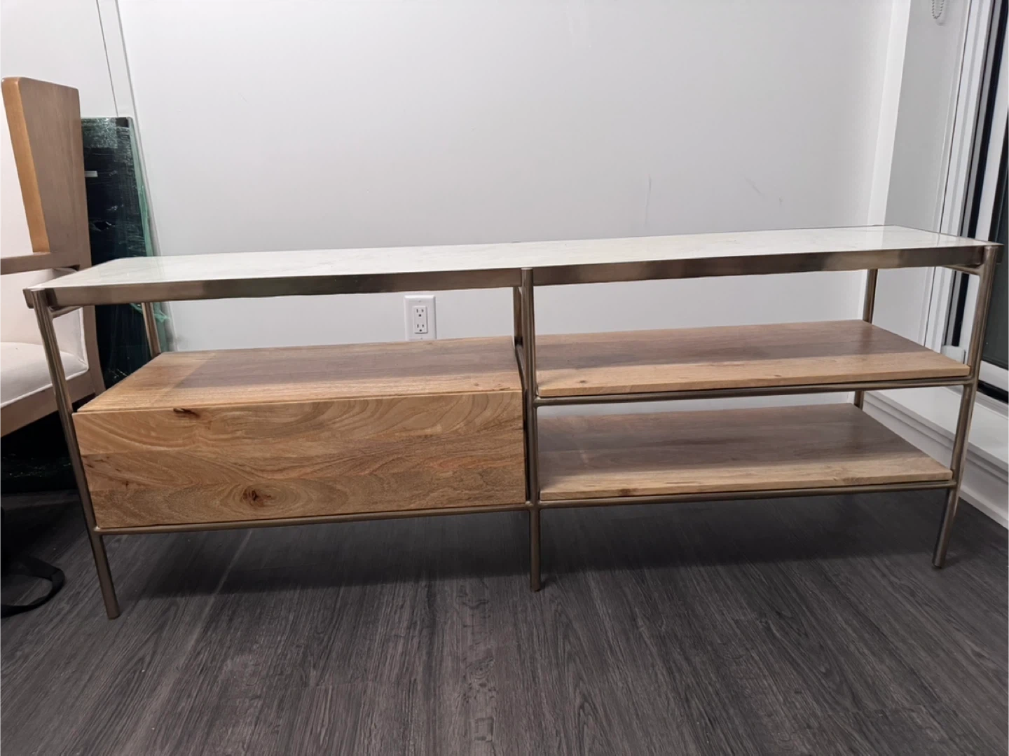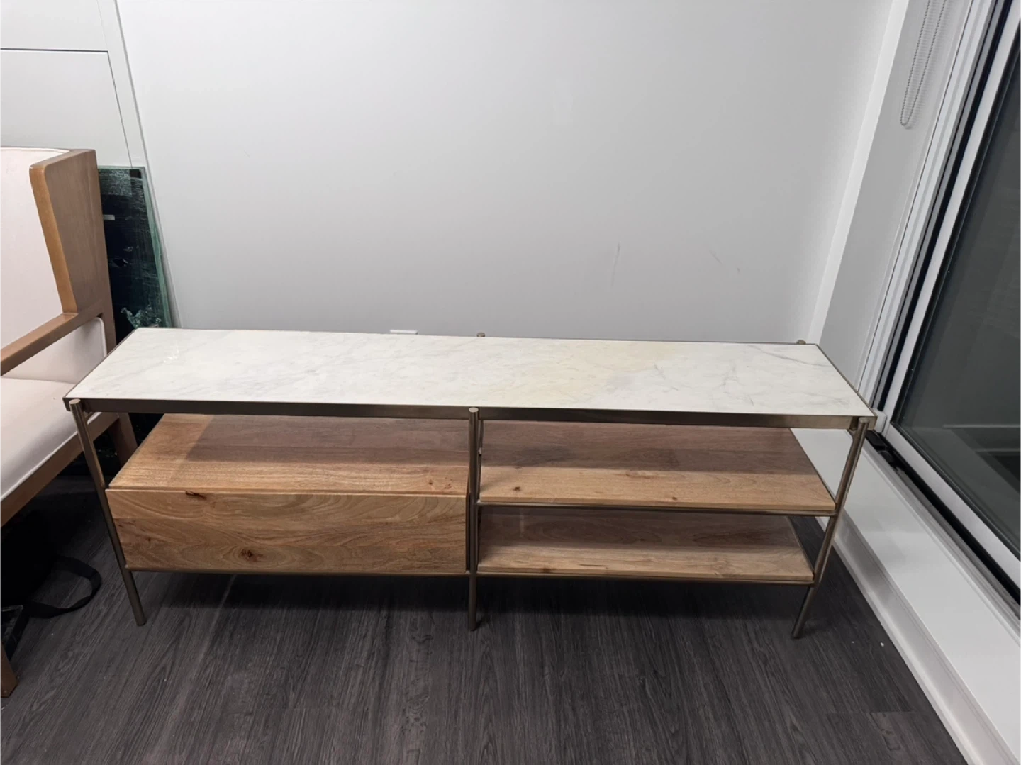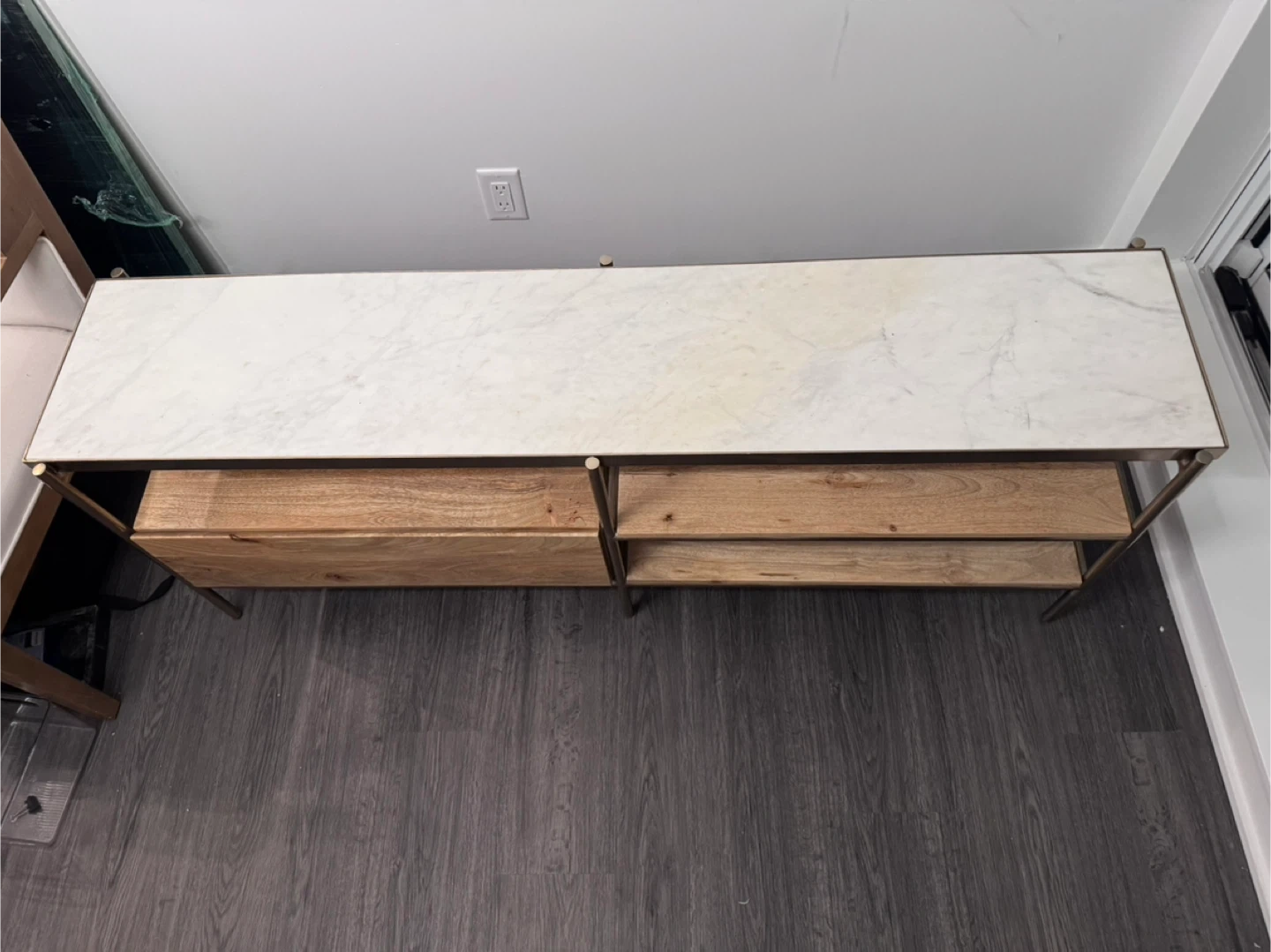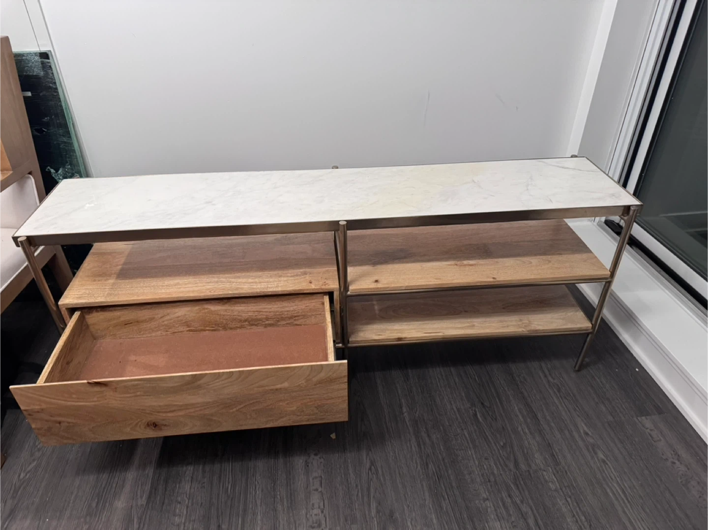 Selling a stylish console table featuring a beautiful marble top and wooden shelves. It has a drawer on one side for storage and open shelving on the other. Perfect for adding a touch of elegance to your living space!