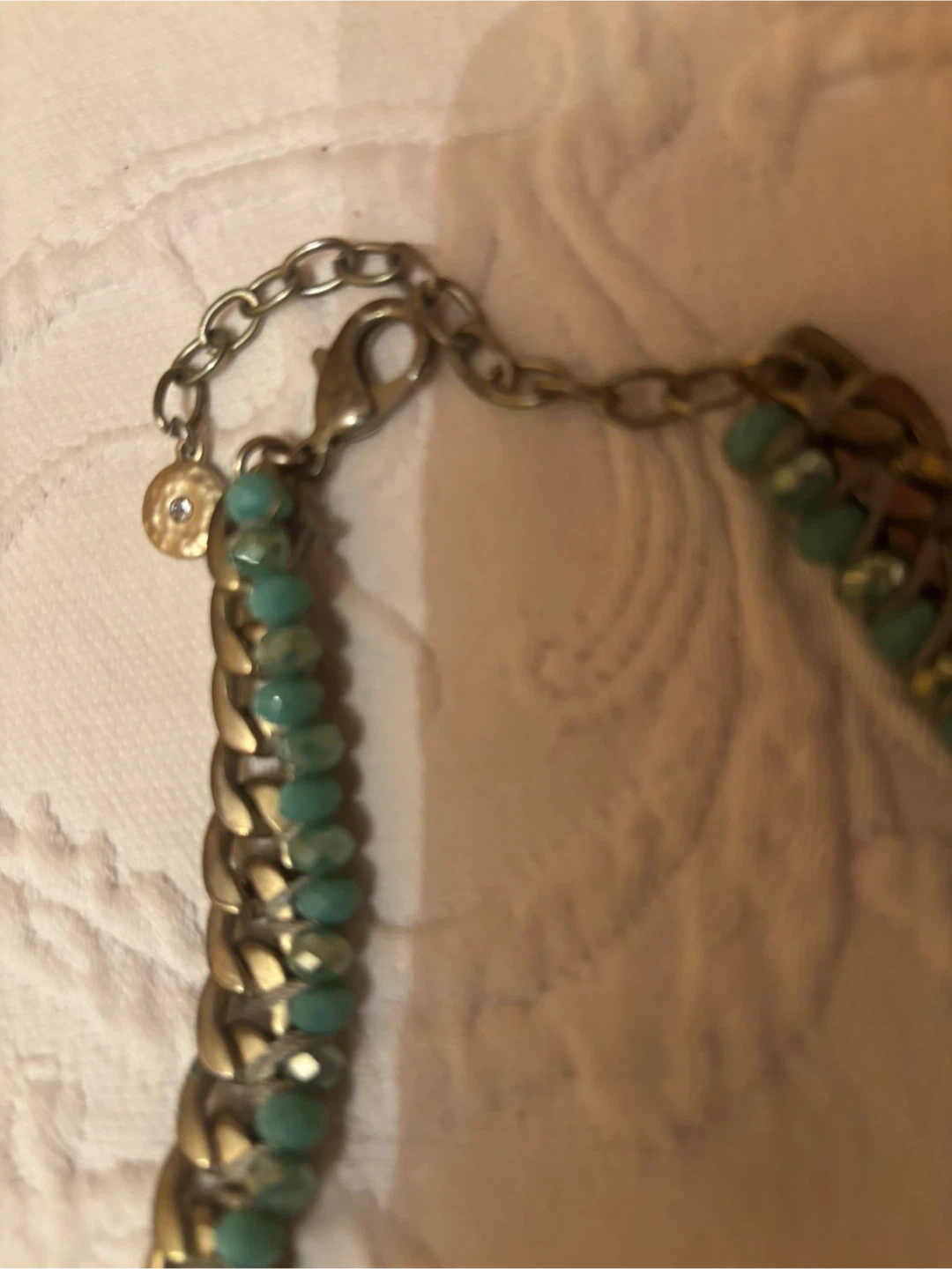 Beautiful statement necklace with turquoise beads and silver-tone chain detailing. It features a mix of stones and floral accents. Perfect for adding a pop of colour to any outfit!