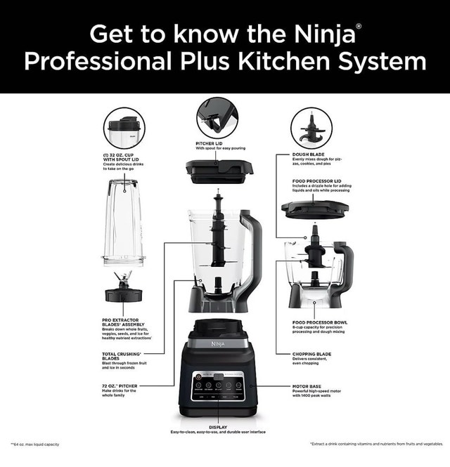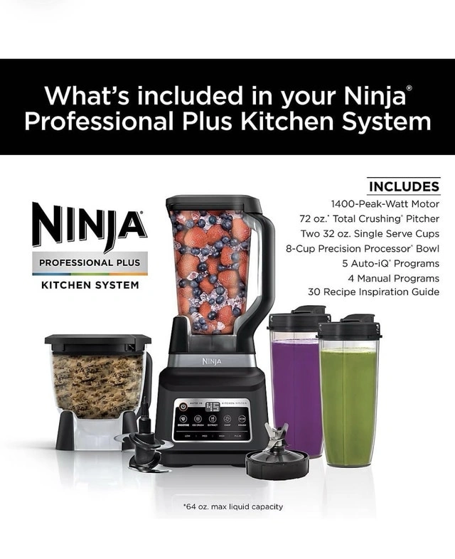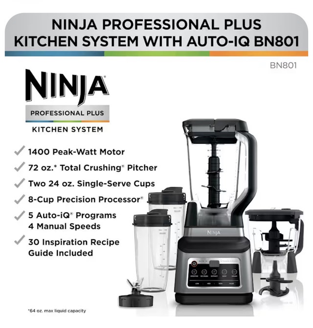 Don’t miss out on this new Ninja Professional Plus Kitchen System with Auto-IQ, model BN801, boasting a powerful 1400-watt motor for all your blending and food processing needs.