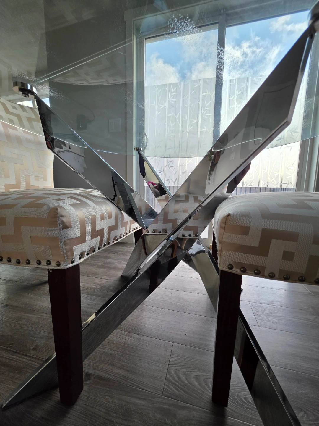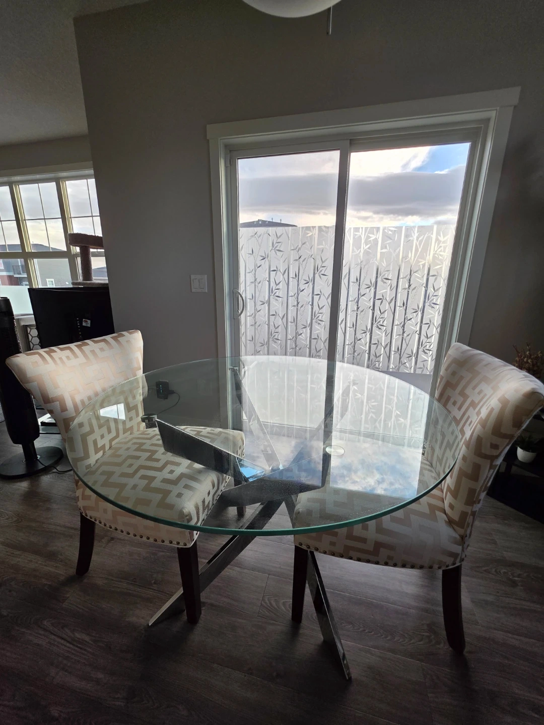 Selling a modern round glass dining table with 2 matching chairs in excellent condition.