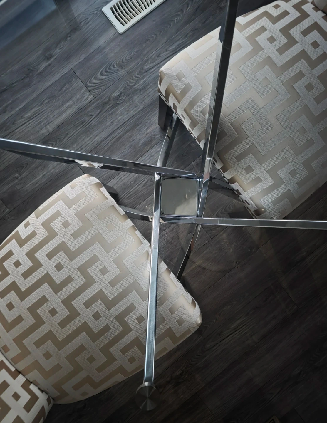 The chairs have a unique patterned upholstery. The table features a modern chrome base. It's a stylish set that would look great in any setting.
