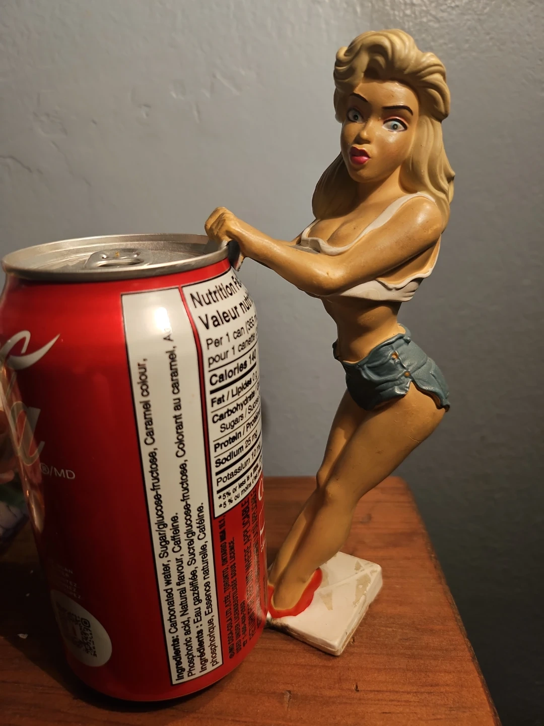 Vintage pin-up style figurine can holder compatible with any 350 mL beverage can. Ideal for collectors or anyone looking to add a bold, nostalgic touch to their décor.