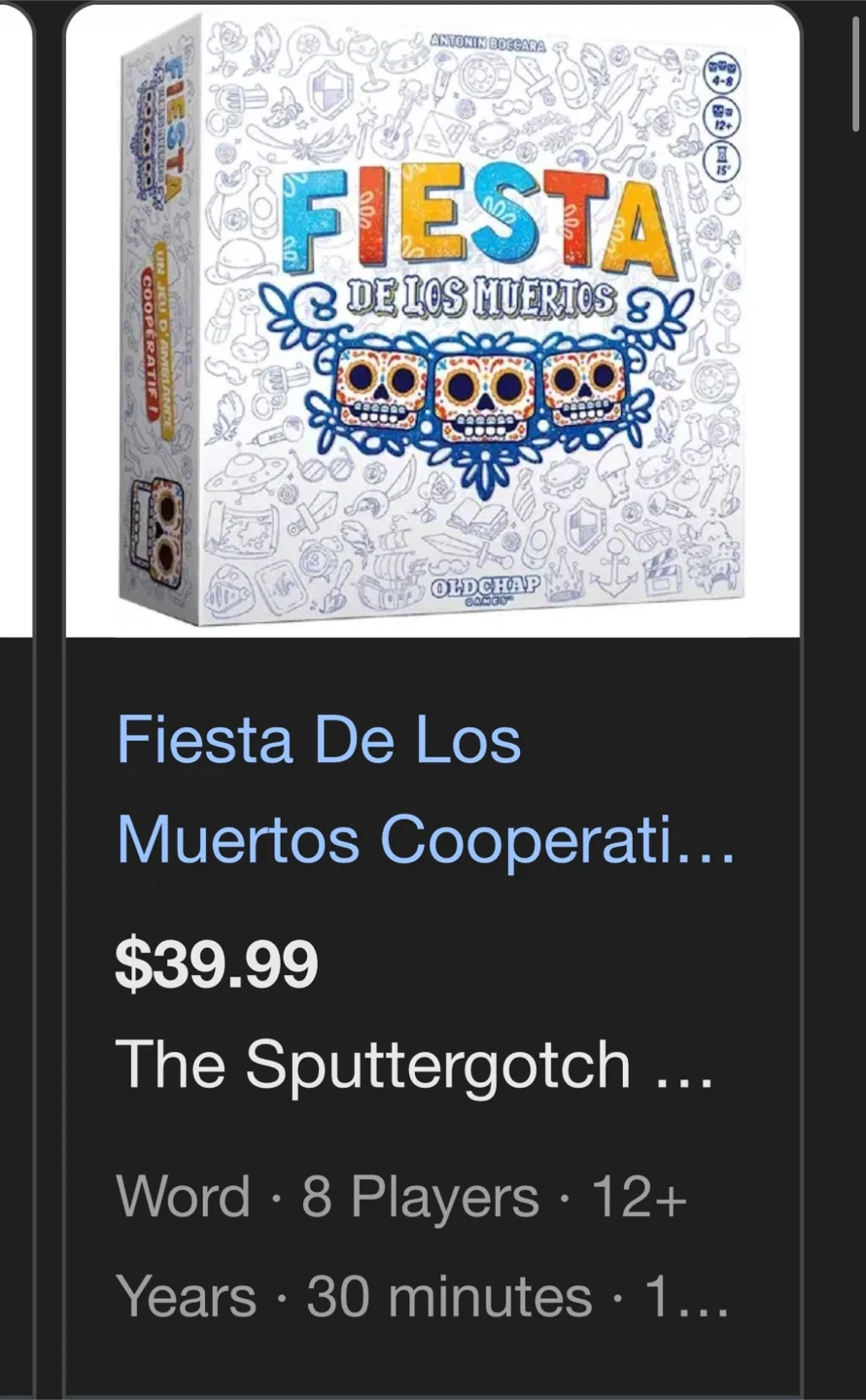 Selling a Fiesta de los Muertos board game! It's a fun game for 4-8 players, ages 12+. Comes with all the pieces and the box.